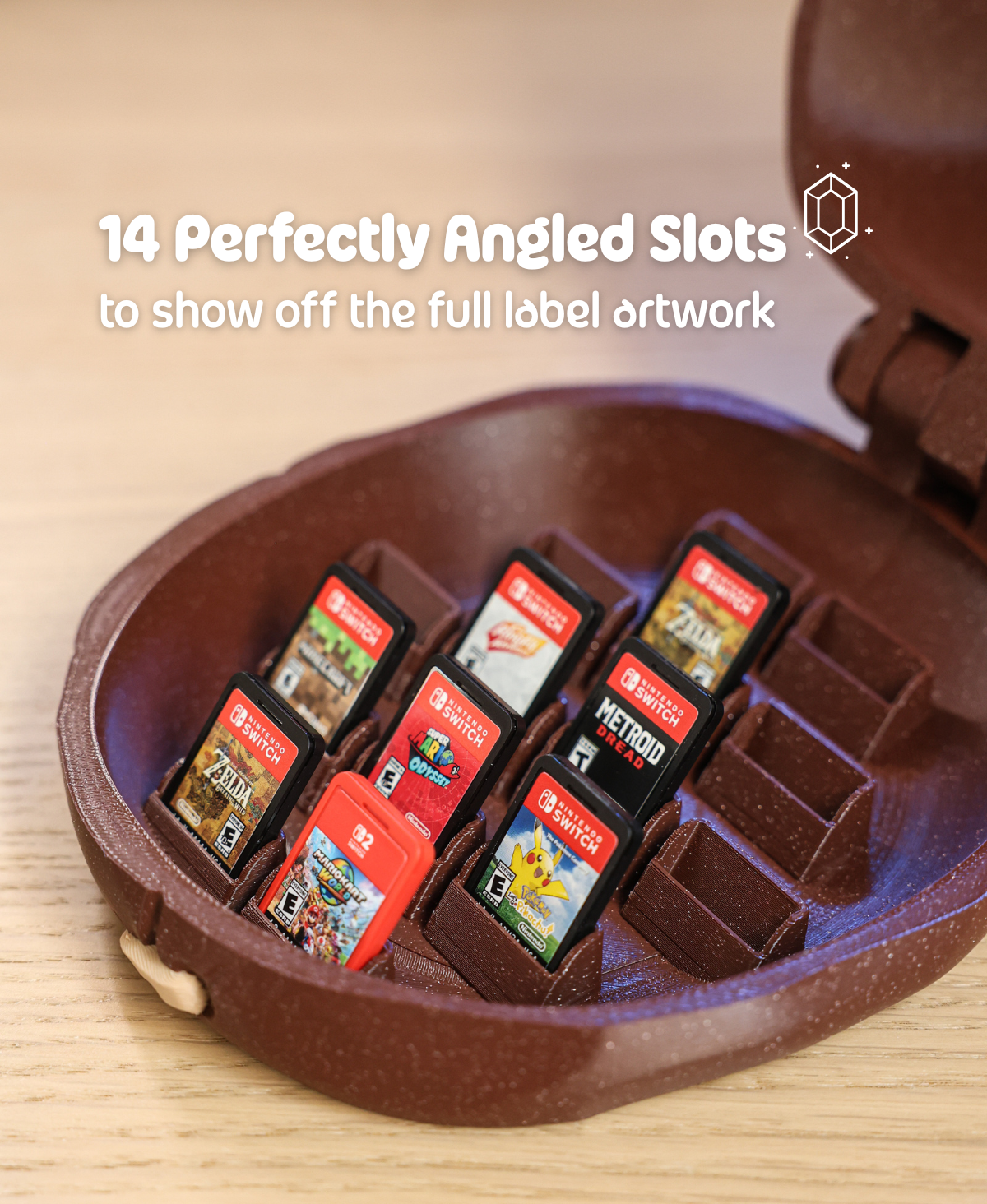 - Bevat 14 speciaal gehoekte sleuven die een volledig zicht op de labelkunst van het spel garanderen.