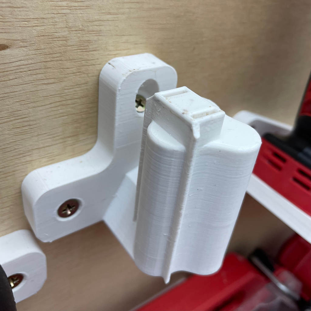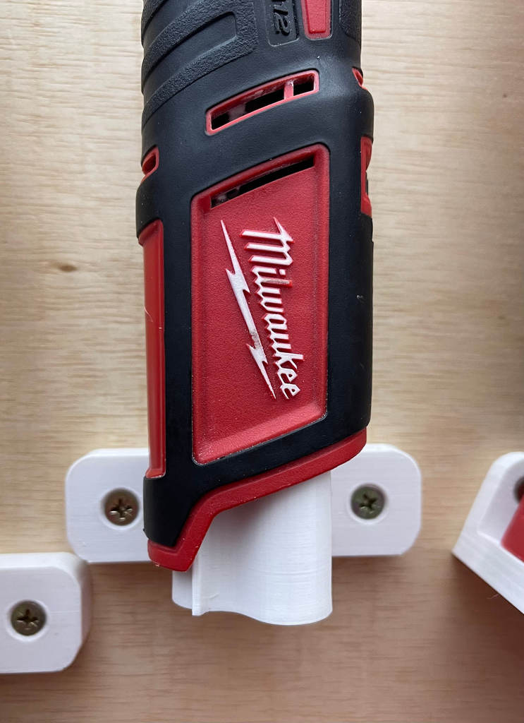 Dit is een wandmontage voor Milwaukee M12-gereedschap. De belangrijkste verbeteringen zijn onder meer een 90 graden gedraaide houder, zodat het gereedschap nu parallel loopt aan de muur waarop het is gemonteerd. Hierdoor kunnen grotere gereedschappen worden gemonteerd. Daarnaast is de wandhoogte vergroot voor meer steun en gemakkelijkere toegang tot de bovenste schroef. Ten slotte is de diameter van de bovenste schroef vergroot en zakt de schroef nu volledig weg.