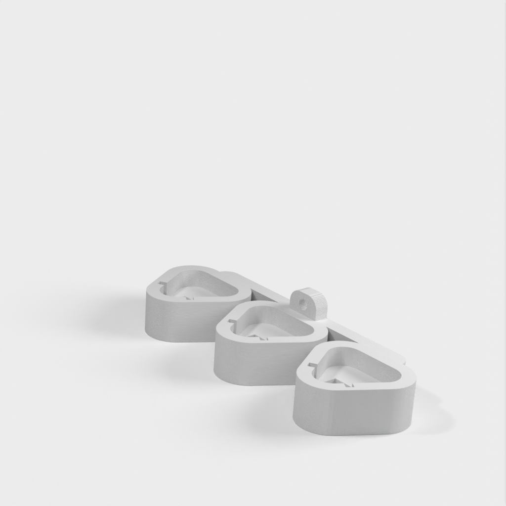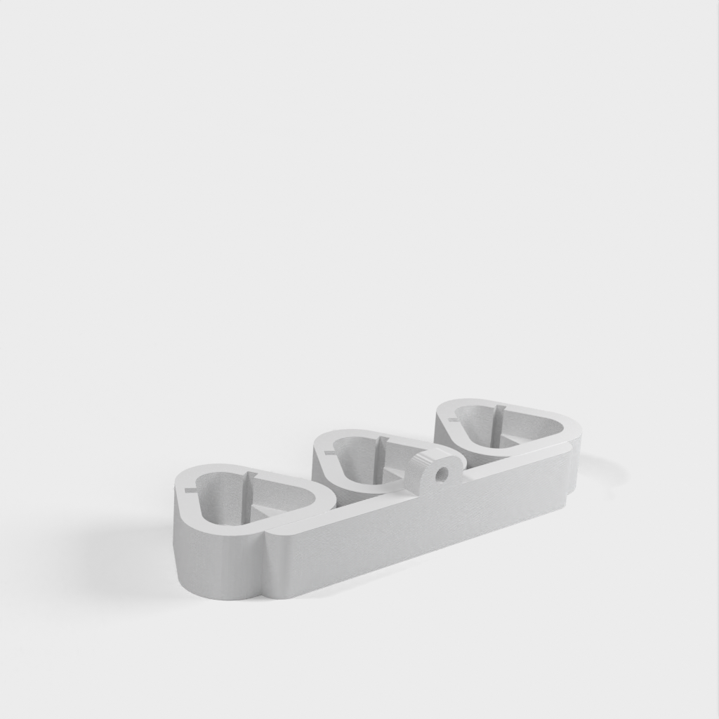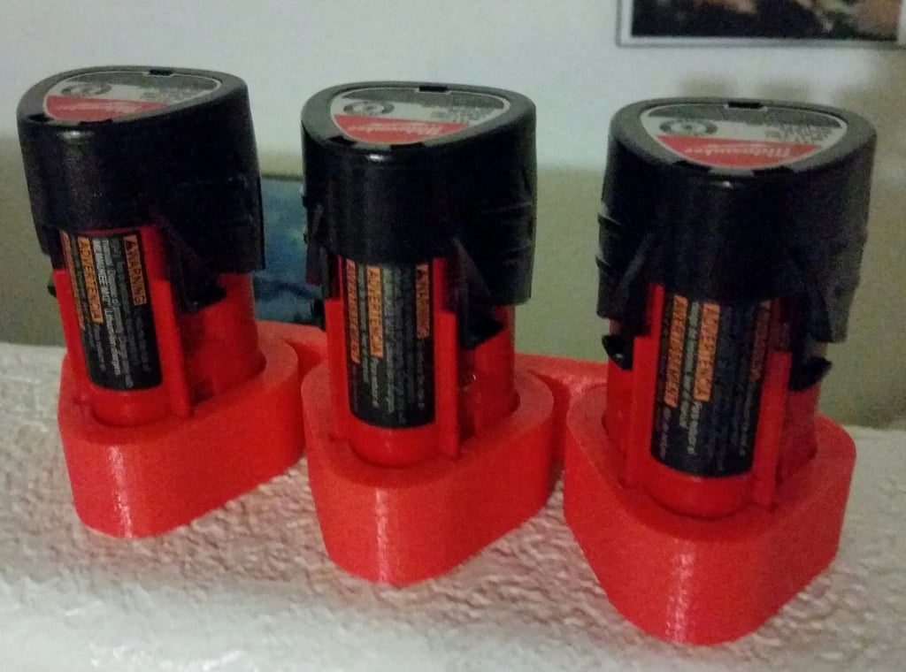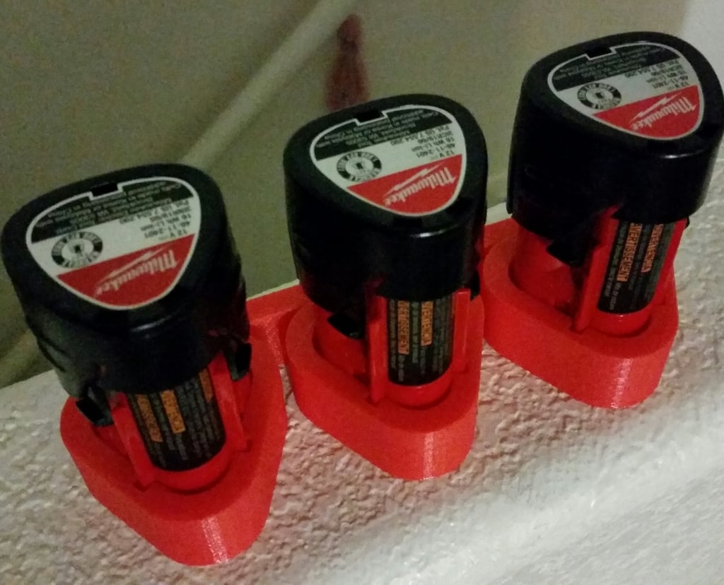Milwaukee M12 drievoudige batterijhouder voor het veilig en georganiseerd opbergen van Milwaukee M12 batterijen. Deze batterijhouder is ontworpen om perfect op de batterijen te passen en ze veilig vast te zetten. Aan de achterkant van de houder zit een klein gaatje om hem op te hangen als je de houder aan de muur wilt bevestigen. De fabrikant raadt rood pla aan voor afdrukken bij 210c, en er is geen ondersteuning nodig.