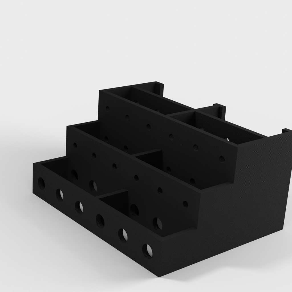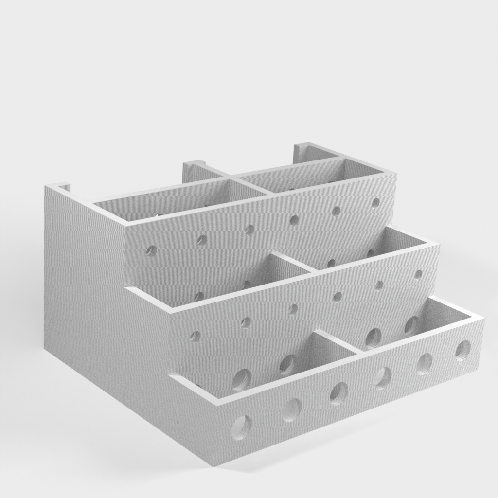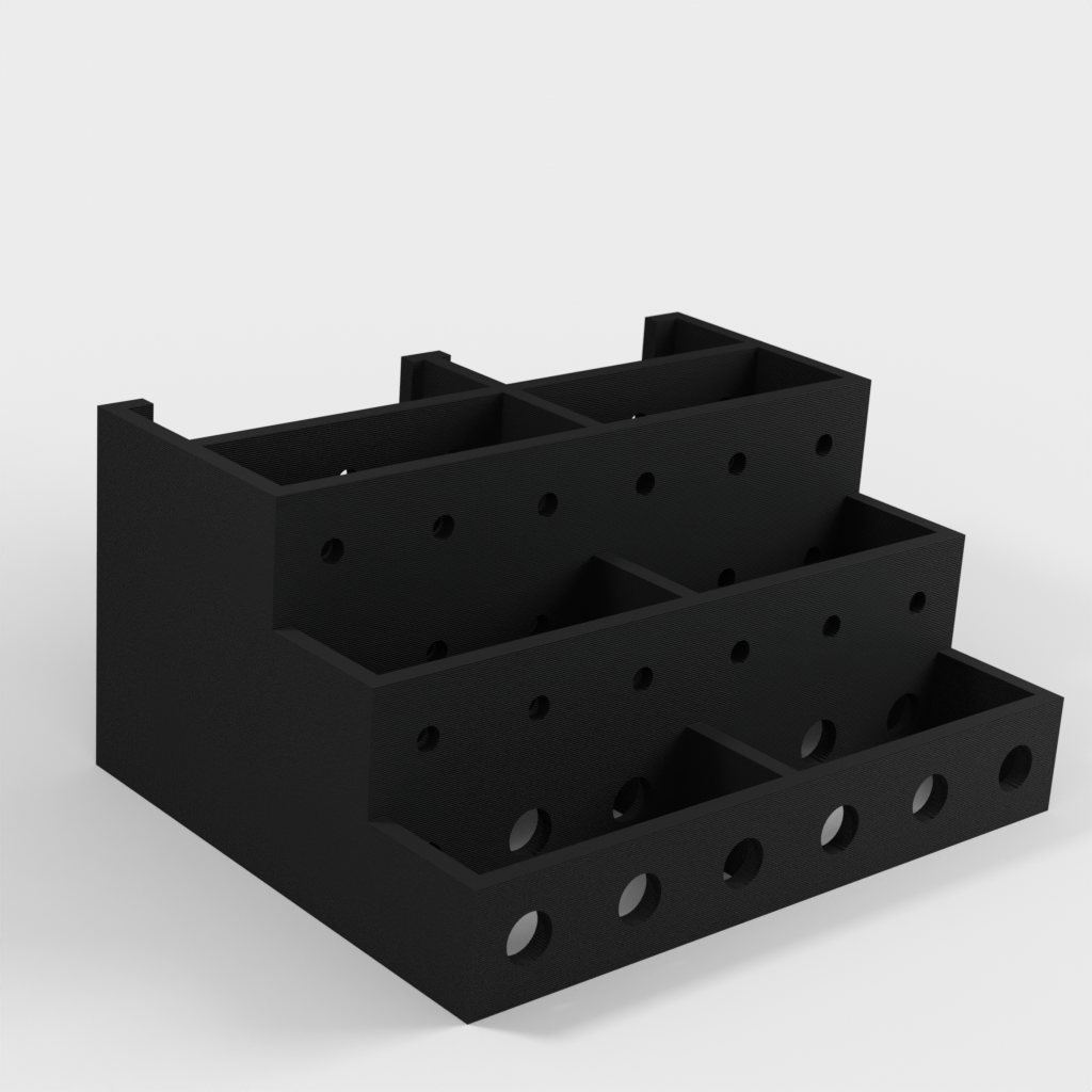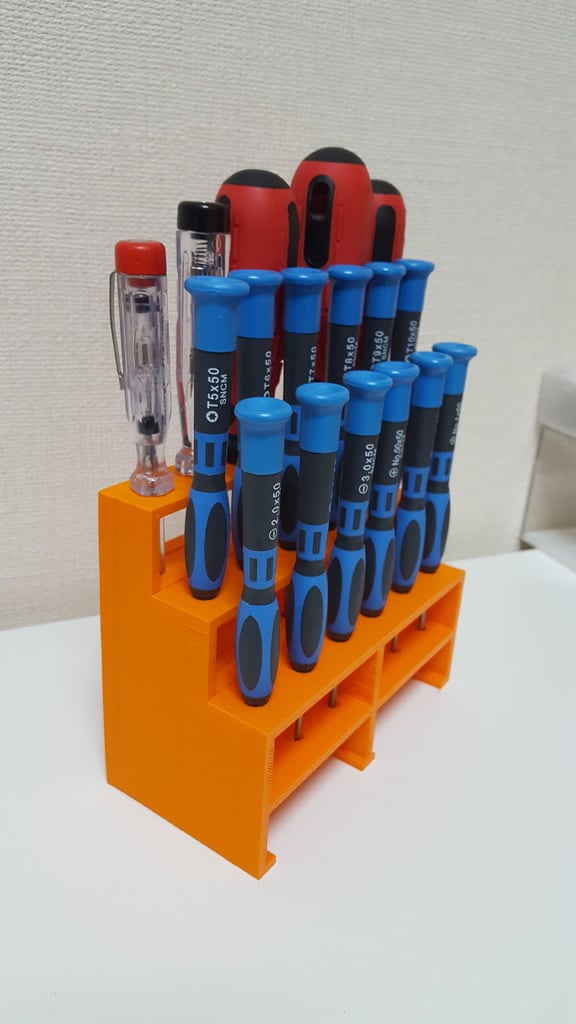Met deze schroevendraaierhouder heb je eenvoudig en praktisch controle over je schroevendraaiers. De houder biedt plaats aan 3 sets van 6 schroevendraaiers, zodat je altijd een geordend overzicht van je gereedschap hebt. Elke schroevendraaier heeft zijn eigen plaats, met drie niveaus voor korte, middelgrote en lange schroevendraaiers. Voor een versie voor wandmontage, zie dit ontwerp: https://www.thingiverse.com/thing:1240992