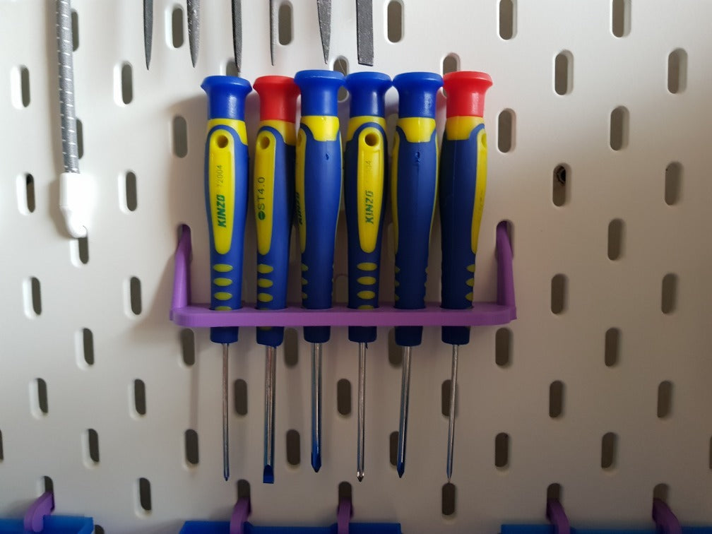 Schroefhouder voor IKEA Skadis (SKÅDIS) wandplaat, ontworpen voor 6 kleinere schroevendraaiers. De houder past perfect in het organisatiesysteem van uw Skadi en maakt het gemakkelijk om uw schroevendraaiers op hun plaats en binnen handbereik te houden. Deze houder is goed ontworpen voor schroevendraaiers met handvatten die kleiner zijn dan het metalen gedeelte en heeft een volledige uitsparing om ze in te schuiven. Hij wordt geleverd met 7 stopcontacten, maar er kunnen slechts 6 schroevendraaiers tegelijk in.
