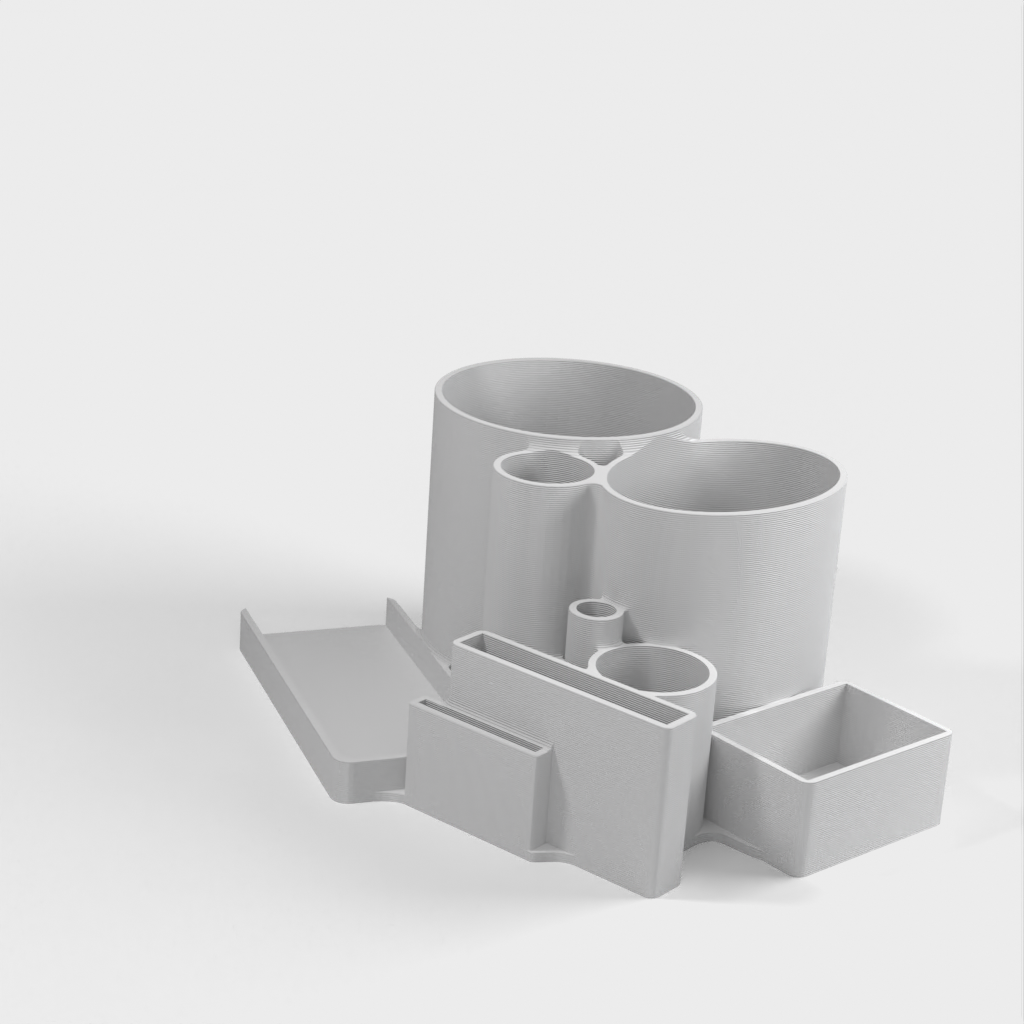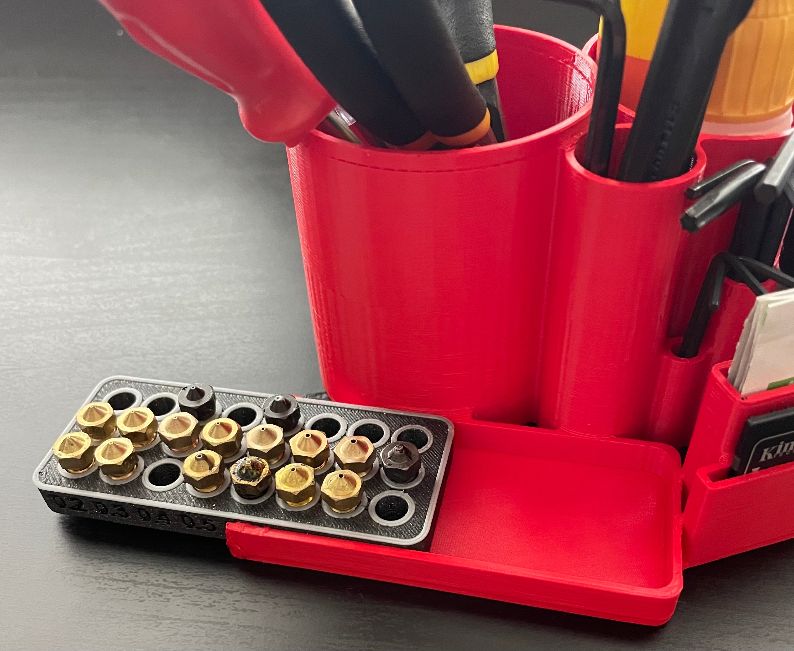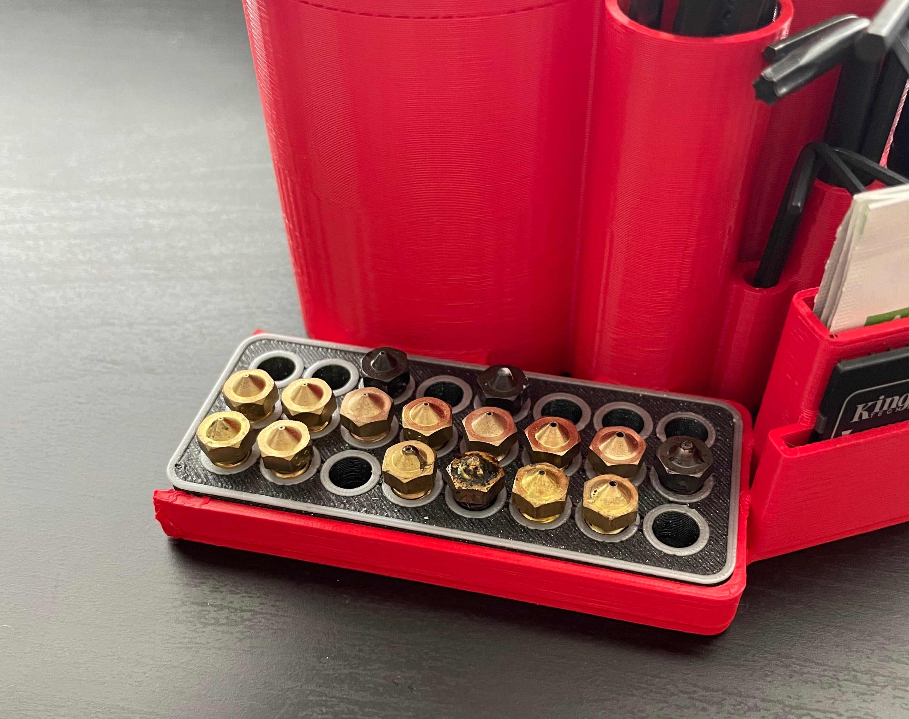 Een gereedschaphouder en organizer die ik heb ontworpen om al mijn gereedschap in op te bergen. Hij past comfortabel naast de printer. Hij is compatibel met deze spuitmondhouder: https://www.prusaprinters.org/prints/57441-nozzle-organizer. Gereedschap zoals spuitmondjes, kwasten, lijm, tangen, schroevendraaiers, inbussleutels, microSD-kaarten, SD-kaarten en lappen kunnen allemaal in deze houder worden opgeborgen. Het zorgt voor eenvoudige en nette opslag en toegang tot je benodigde gereedschap.