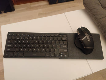 - De muismat kan aan de achterkant van het toetsenbord worden opgeborgen wanneer deze niet in gebruik is, voor een opgeruimde oplossing.