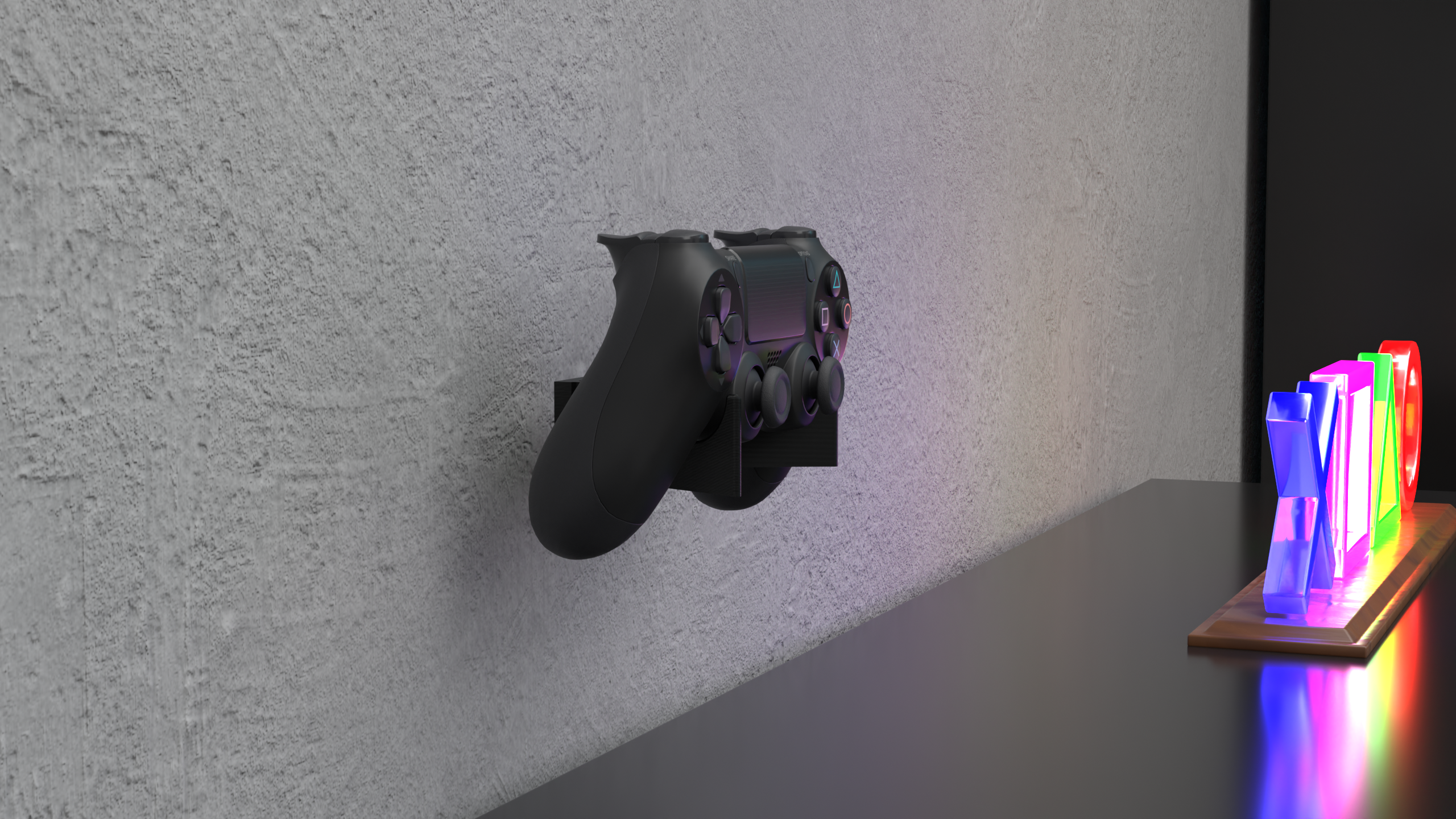 Slanke wandbeugel voor een PS4-controller, met tegelijkertijd ruimte voor de oplaadkabel terwijl de controller in de houder zit.
