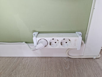 De montage is flexibel, aangezien de beugel boven plinten of andere bases kan worden geplaatst, en de componenten eenvoudig kunnen worden gespiegeld om aan verschillende installatiebehoeften te voldoen. Met deze slimme cord holder krijgt u een discrete en functionele oplossing om uw kabels in de gaten te houden en rommel te voorkomen.