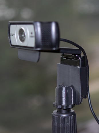 Statiefadapter voor een Logitech C920/C930 camera, waarmee je hem op een microfoonstatief kunt plaatsen, zodat hij vrij op en neer kan bewegen.