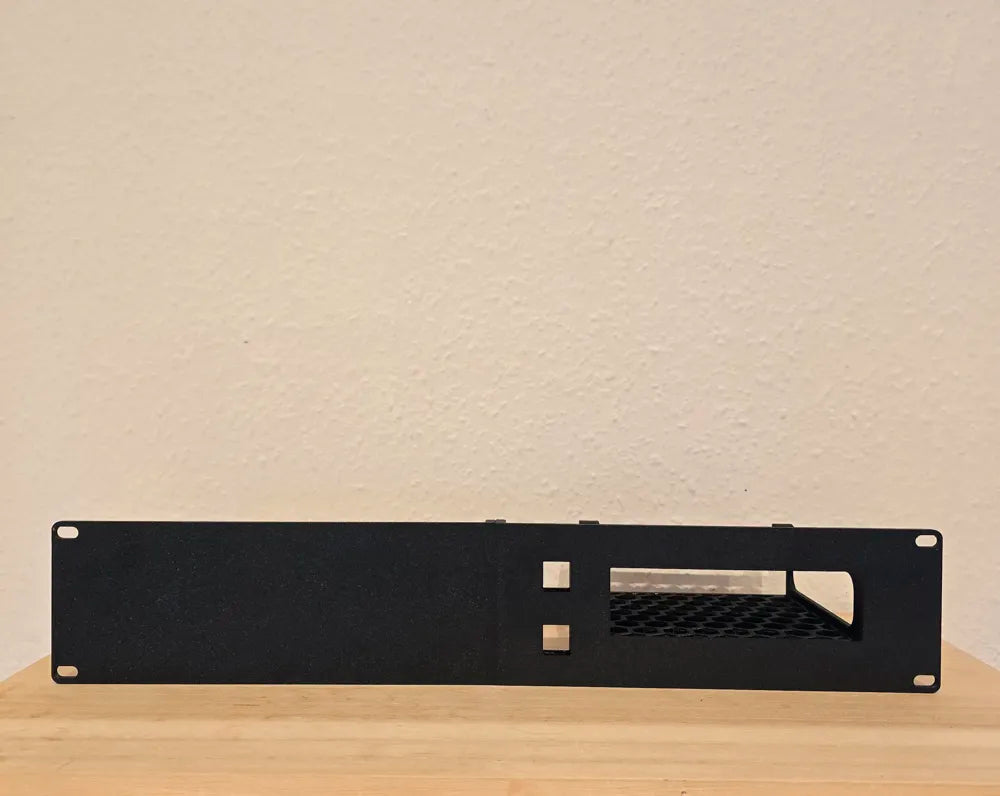 Dette 2U beslag er designet til sikker montering af en Sonos Port i et standard 19-tommer rackskab. Enheden placeres bagfra og holdes stabilt på plads, hvilket sikrer en organiseret integration af lydudstyret i dit rack-setup. Løsningen er ideel til professionelle AV-installationer og serverrum.