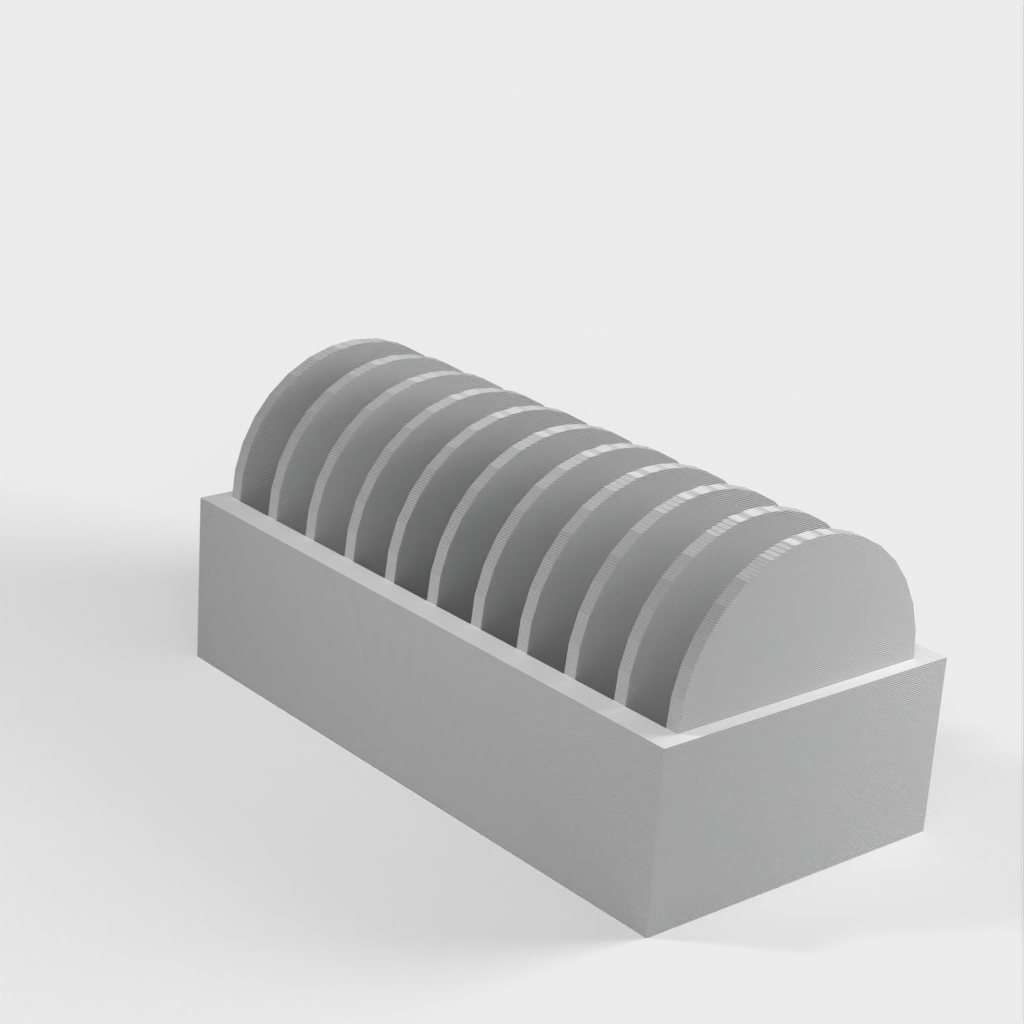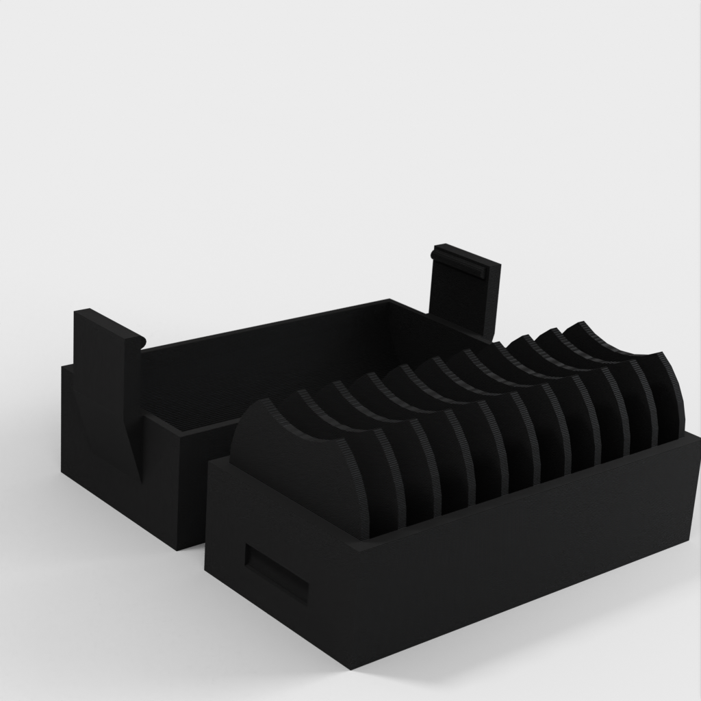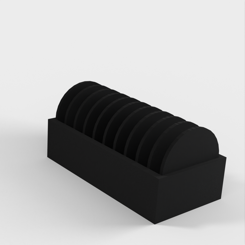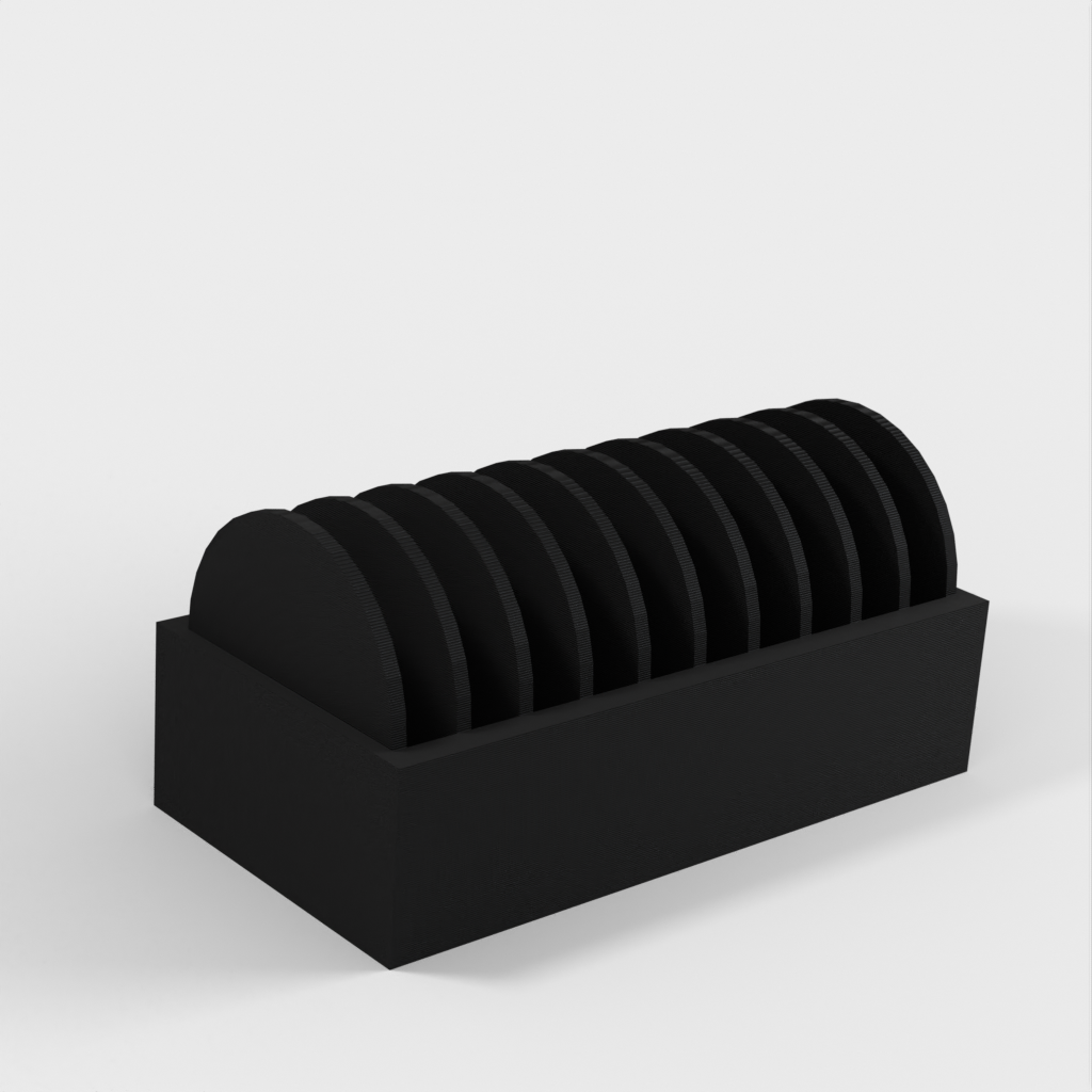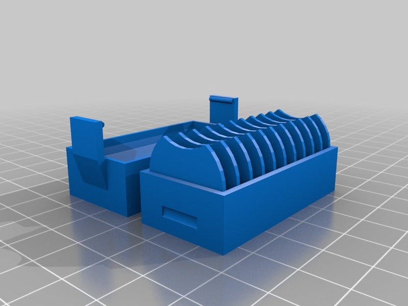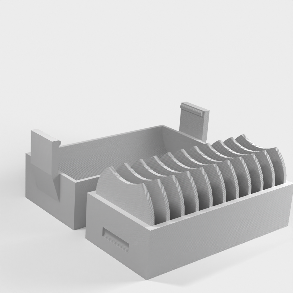 Een kleine houder voor 10 CR2032 muntbatterijen. Er is een nieuwe versie toegevoegd met een deksel waardoor de batterijen er gemakkelijker in kunnen worden gedaan en eruit gehaald. Het deksel heeft een clip om de batterijen op hun plaats te houden als het deksel omvalt.
