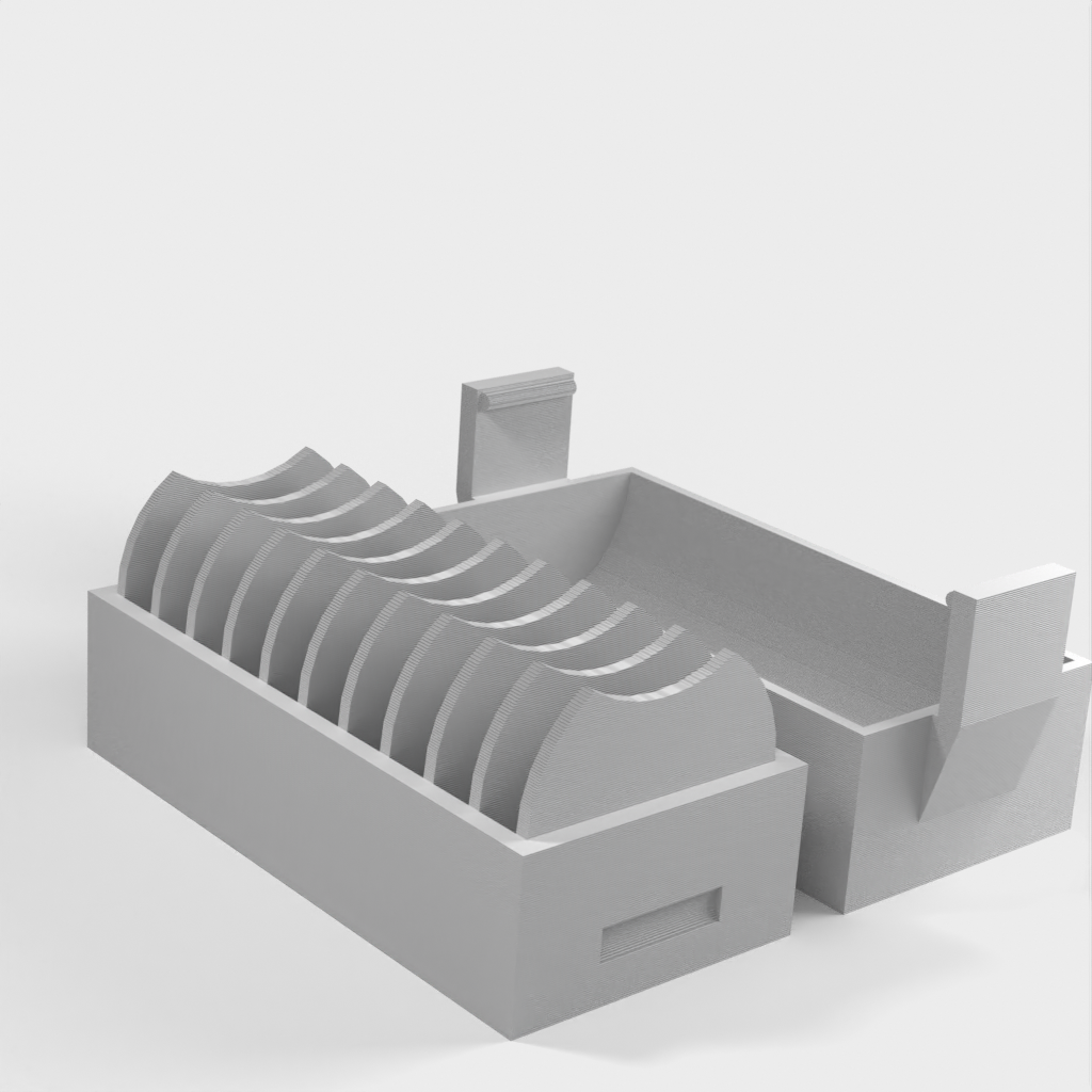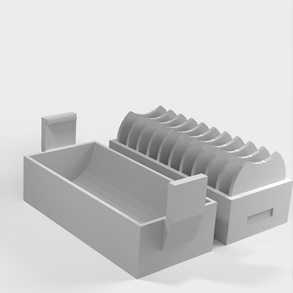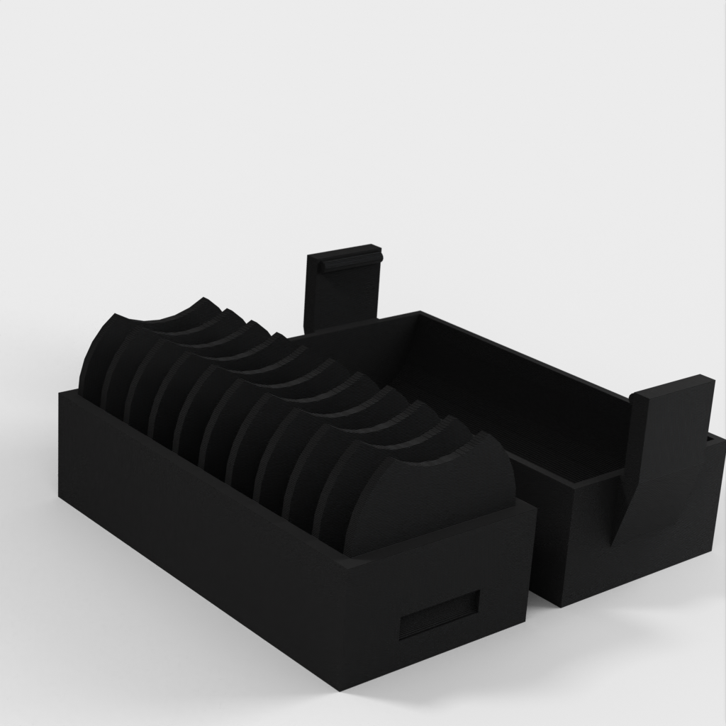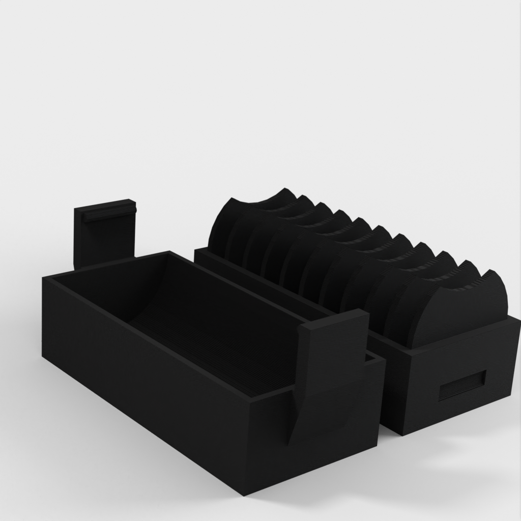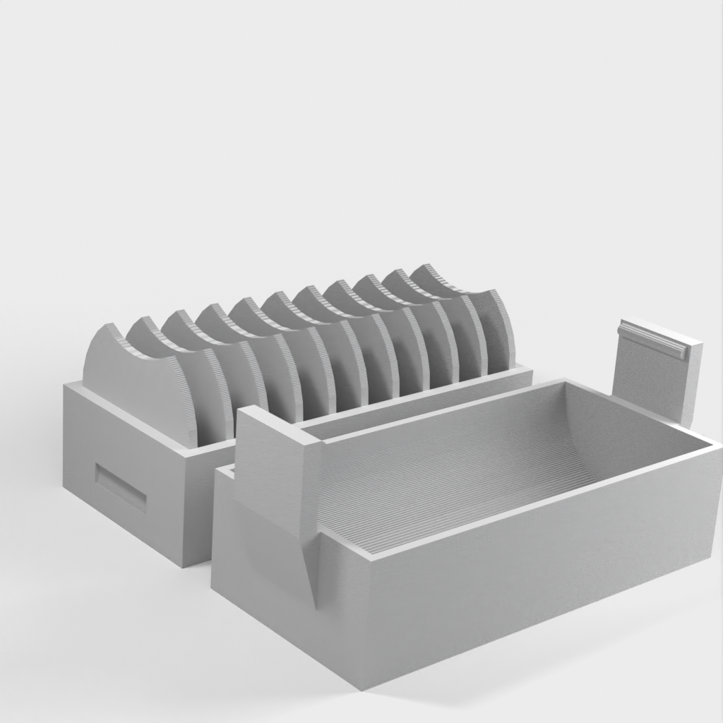 Een kleine houder voor 10 CR2032 muntbatterijen. Er is een nieuwe versie toegevoegd met een deksel waardoor de batterijen er gemakkelijker in kunnen worden gedaan en eruit gehaald. Het deksel heeft een clip om de batterijen op hun plaats te houden als het deksel omvalt.