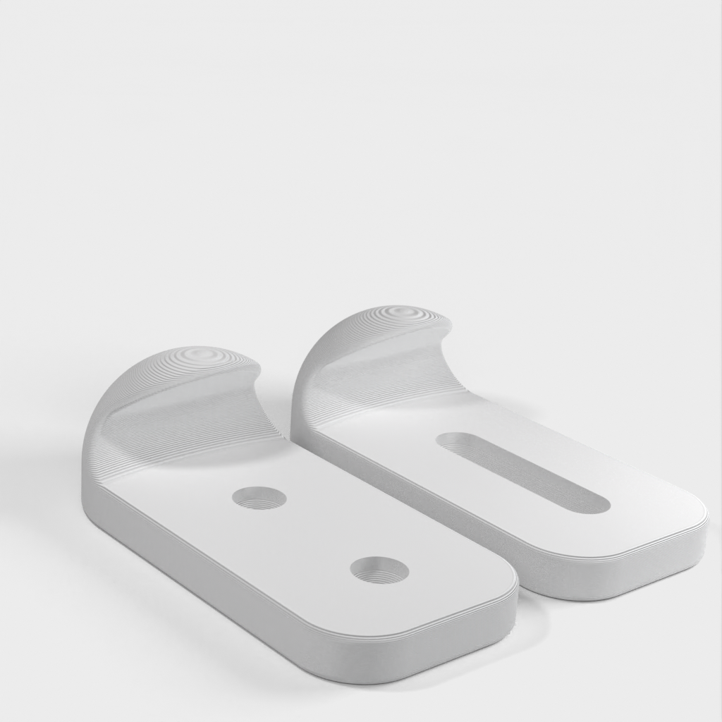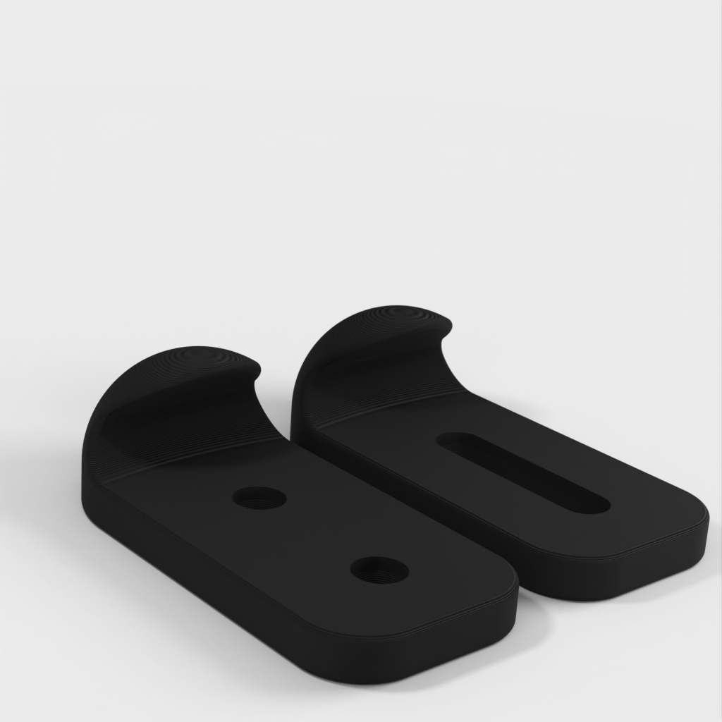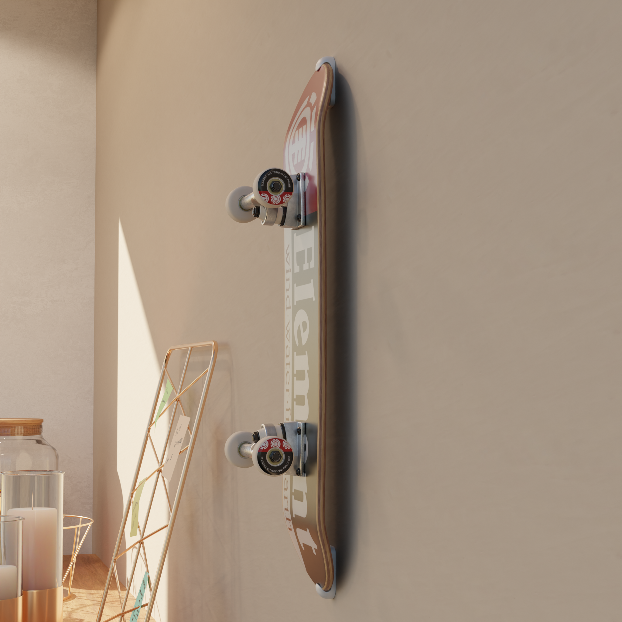 Wandhouder voor een skateboard, die breder is ontworpen met interne curven om de afgeronde rand van een skateboard beter vast te pakken. De bevestigingsgaten van de montage zijn kleiner om te passen op verzonken schroeven van 3,5 mm, wat zorgt voor een robuuste en veilige bevestiging aan de muur.