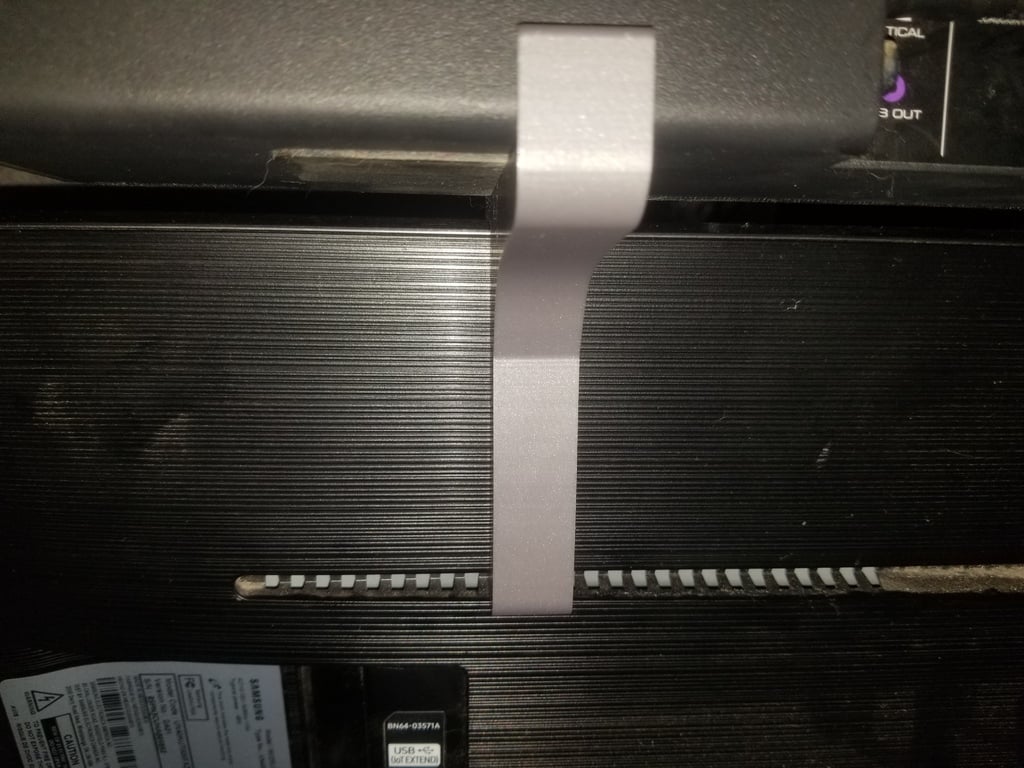 Eenvoudige wandmontage voor een Vizio SB2920-C6 soundbar die bovenop een 40" Samsung KU7000 serie TV past. Deze beugel schuift over de bovenkant van de tv en wordt vervolgens eenvoudig aan de achterkant van de tv bevestigd in een ventilatiesleuf, waardoor een nette en opgeruimde installatie ontstaat.