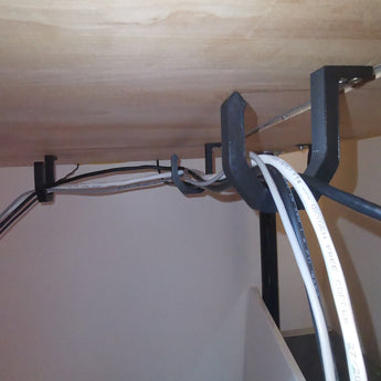 Deze J-haak is ontwikkeld om een efficiënte kabelbeheer onder uw bureau te creëren. Hij is ontworpen om meerdere kabelgeleidingen aan te kunnen en kan gemakkelijk een bundel van maximaal 30 CAT-5e netwerkkabels vasthouden, waardoor hij geschikt is voor zowel thuiskantoren als andere werkstations. Het doel is om kabels te verzamelen en op te bergen om rommel te verminderen en de esthetiek van uw werkruimte te verbeteren. De haak draagt bij aan een meer georganiseerde en veilige opstelling van uw elektronische apparaten. De montage gebeurt via verzonken gaten, die zijn afgestemd op #8 houtschroeven, wat zorgt voor een stabiele en discrete bevestiging aan de onderkant van uw bureau. Deze kabelhouder helpt uw kabels geordend te houden en zorgt voor een nettere en meer functionele omgeving.