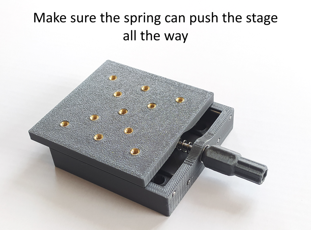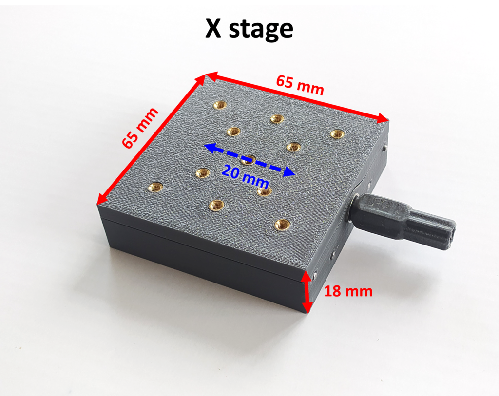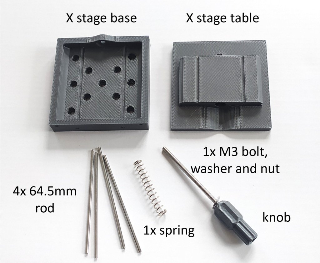 De geprinte lineaire stage is een praktische oplossing voor precisiepositionering met een nauwkeurigheid tot 10 micron. Het ontwerp is ideaal voor projecten waarbij precieze bewegingen cruciaal zijn. Het maakt gebruik van 3D-geprinte onderdelen samen met 2-mm metalen staven, een 40-mm veer en een 55-mm M3-schroef met moer en bijmoer om stabiliteit en functionaliteit te waarborgen.