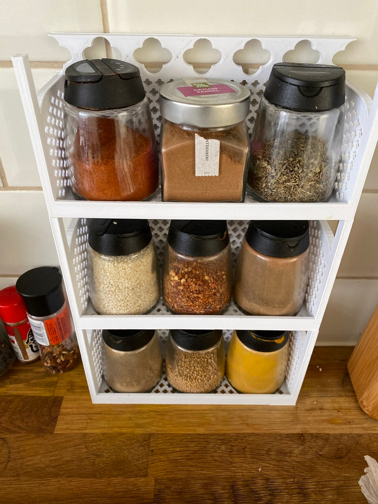 Deze kruidenplank is speciaal ontworpen om perfect te passen op de IKEA 365+ IHÄRDIG kruidenpotten, waardoor u uw kruiden optimaal kunt bewaren in uw keuken. De plank biedt ruimte aan drie kruidenpotten op een rij, met voldoende ruimte boven elke pot voor gemakkelijke toegang en verwijdering. Om de opslagcapaciteit te maximaliseren, kunnen meerdere planken op elkaar worden gestapeld, wat een flexibele en ruimtebesparende oplossing biedt. Hierdoor is het gemakkelijk om uw kruiden georganiseerd en bij de hand te houden, wat bijdraagt aan een meer gestroomlijnde kookervaring.