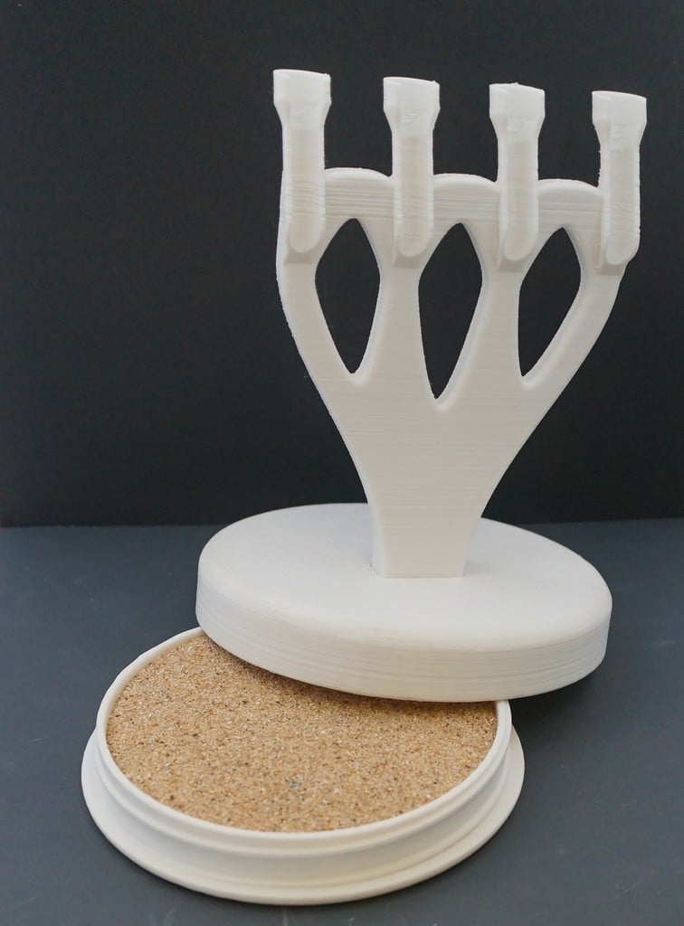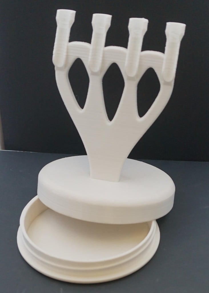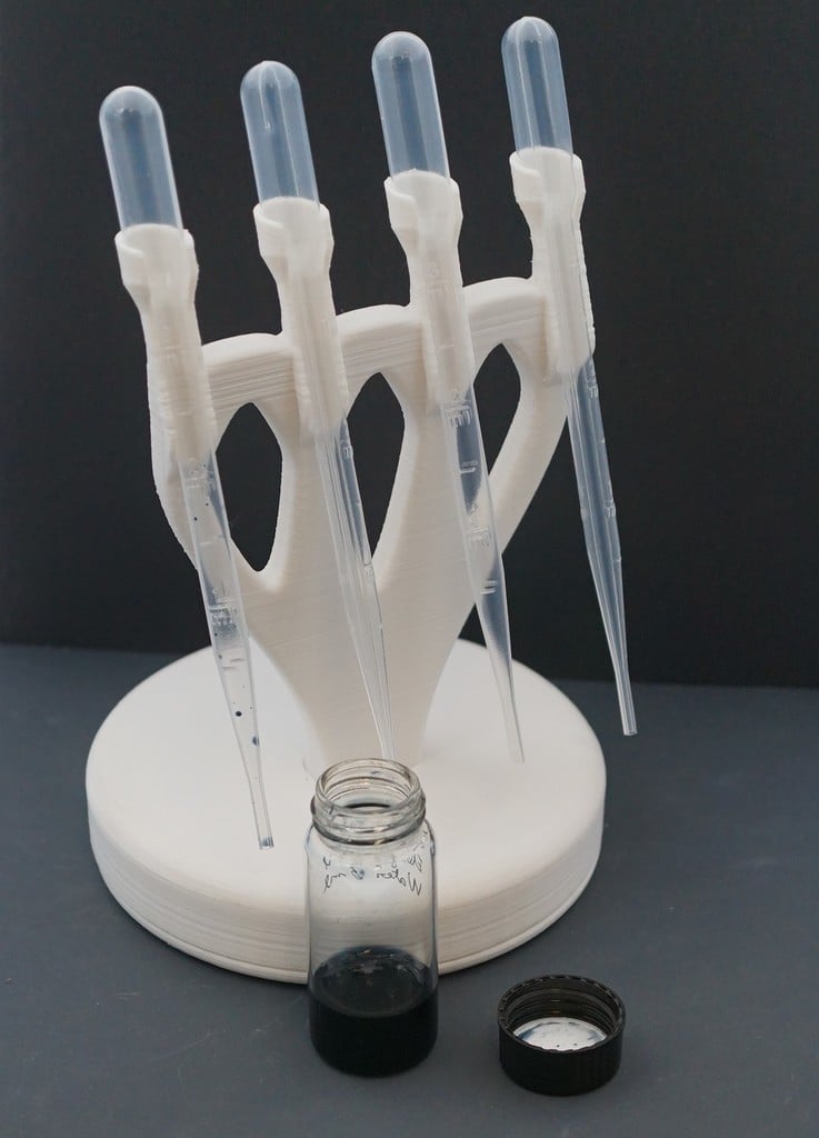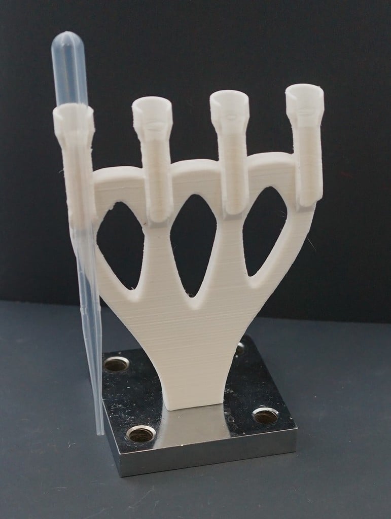 De houder kan gemakkelijk worden bevestigd aan een metalen plaat met een M3-schroef, zodat je je opstelling kunt aanpassen aan je behoeften. De geïntegreerde basis kan in twee delen worden geprint, zodat je deze kunt vullen met zand of een ander materiaal om de stabiliteit te vergroten, wat het een flexibele en nuttige oplossing maakt voor laboratoriumgebruik.
