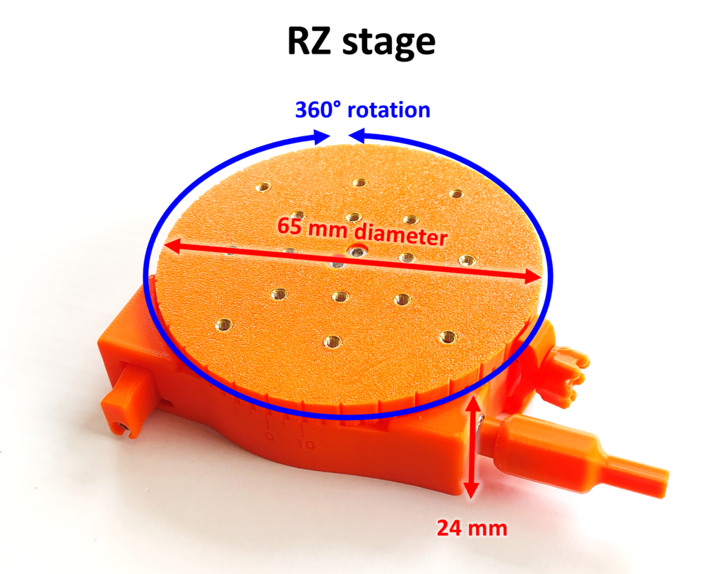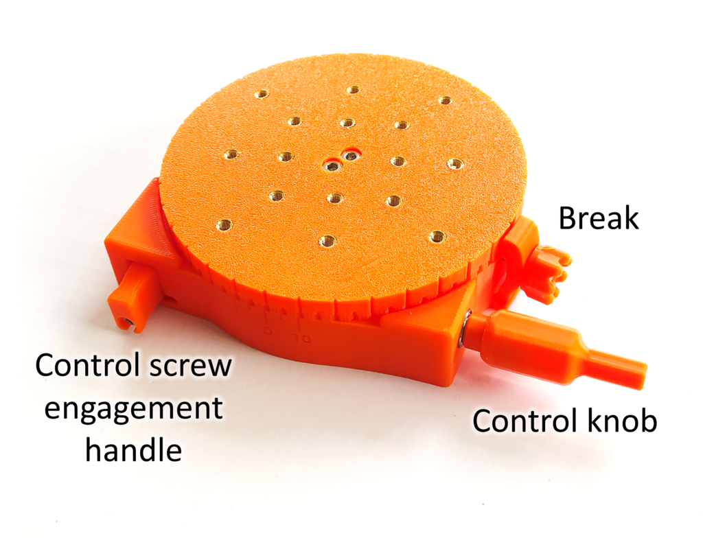 Het geprinte rotatieplatform is ontworpen voor nauwkeurige bewegingen, wat een positionele nauwkeurigheid tot 10 micrometer mogelijk maakt. Het bestaat uit 3D-geprinte onderdelen en 6200 en MR95-zz kogelrollen, wat zorgt voor soepele rotatie. Het platform is ideaal voor toepassingen waarbij nauwkeurigheid cruciaal is, zoals micromanipulatie en optische afstemming.