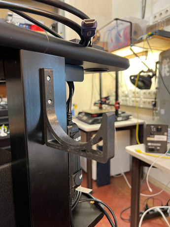 Hij is ontworpen om stabiliteit te behouden en de kabels op hun plaats te houden, zelfs wanneer de kar in beweging is. De bevestiging gebeurt eenvoudig en veilig met twee M3-kruiskopschroeven, wat zorgt voor een betrouwbare montage. Deze kabelhaak is een functioneel element dat bijdraagt aan een meer georganiseerde en efficiënte werkruimte, waar bedrading netjes bij elkaar wordt gehouden en binnen handbereik is.