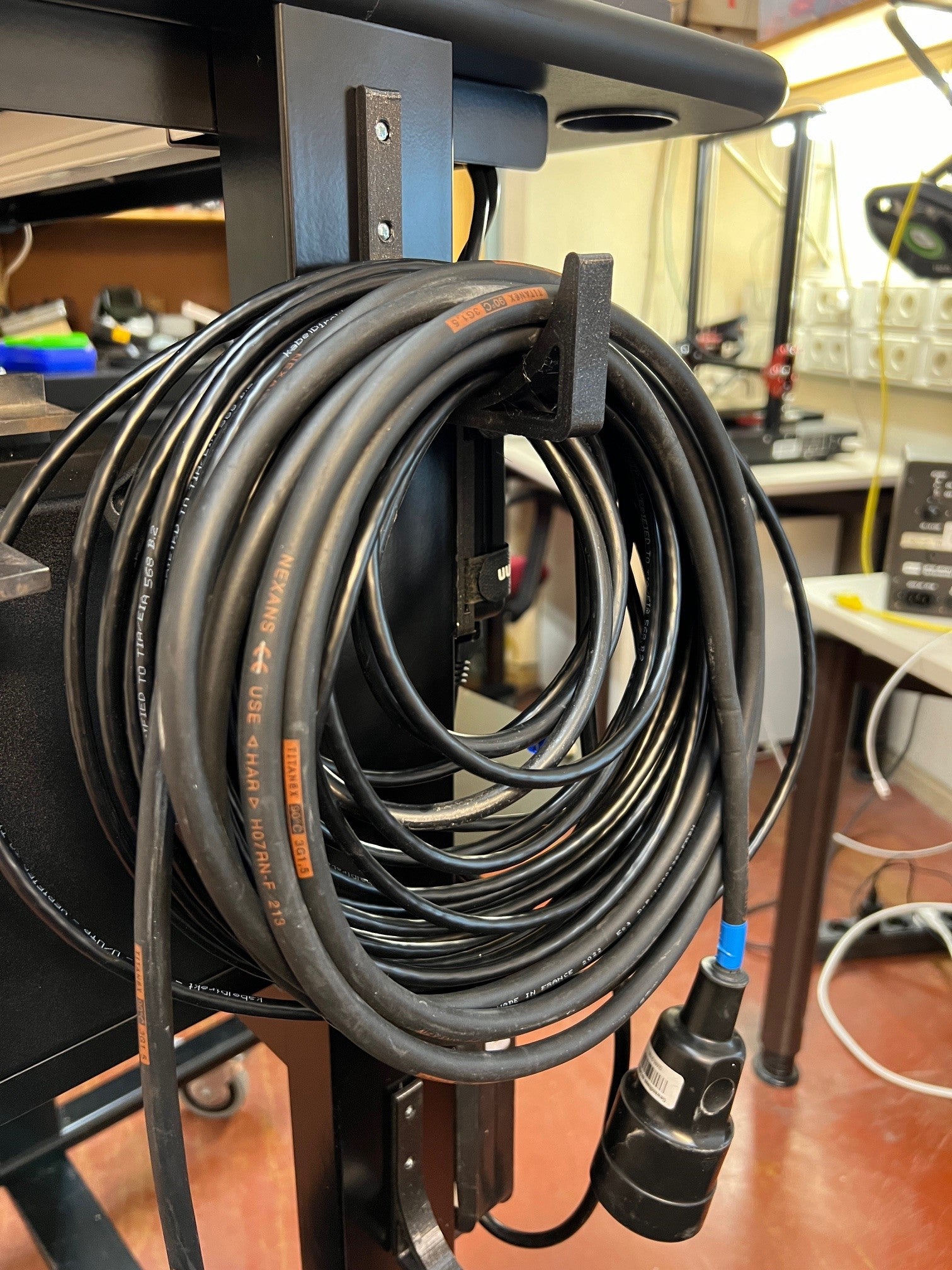 Deze robuuste kabelhouder is ontworpen om een praktische en veilige oplossing te bieden voor kabelbeheer, vooral op rollende karren. Met een afmeting van ongeveer 90x90 mm biedt hij voldoende ruimte om verschillende kabeltypes zoals XLR- en stroomkabels te ordenen, waardoor hij ideaal is voor gebruik in studio's, werkplaatsen of tijdens evenementen.