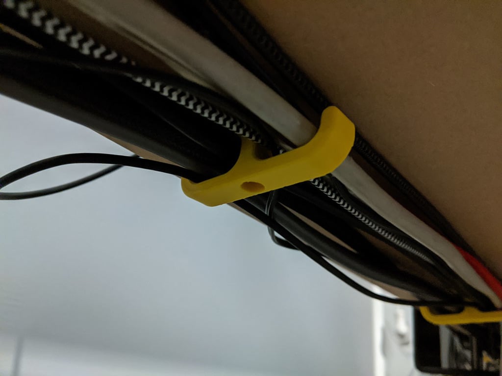 Deze eenvoudige kabelhouder is ontworpen om kabels effectief onder een bureau te organiseren. Het biedt een discrete en praktische methode om kabels bij elkaar te houden, waardoor rommel wordt verminderd en een meer geordende werkplek wordt bevorderd. Door de kabels onder het tafelblad te houden, zorgt het voor een opgeruimd uiterlijk.