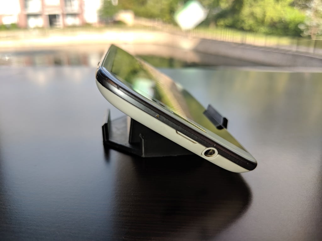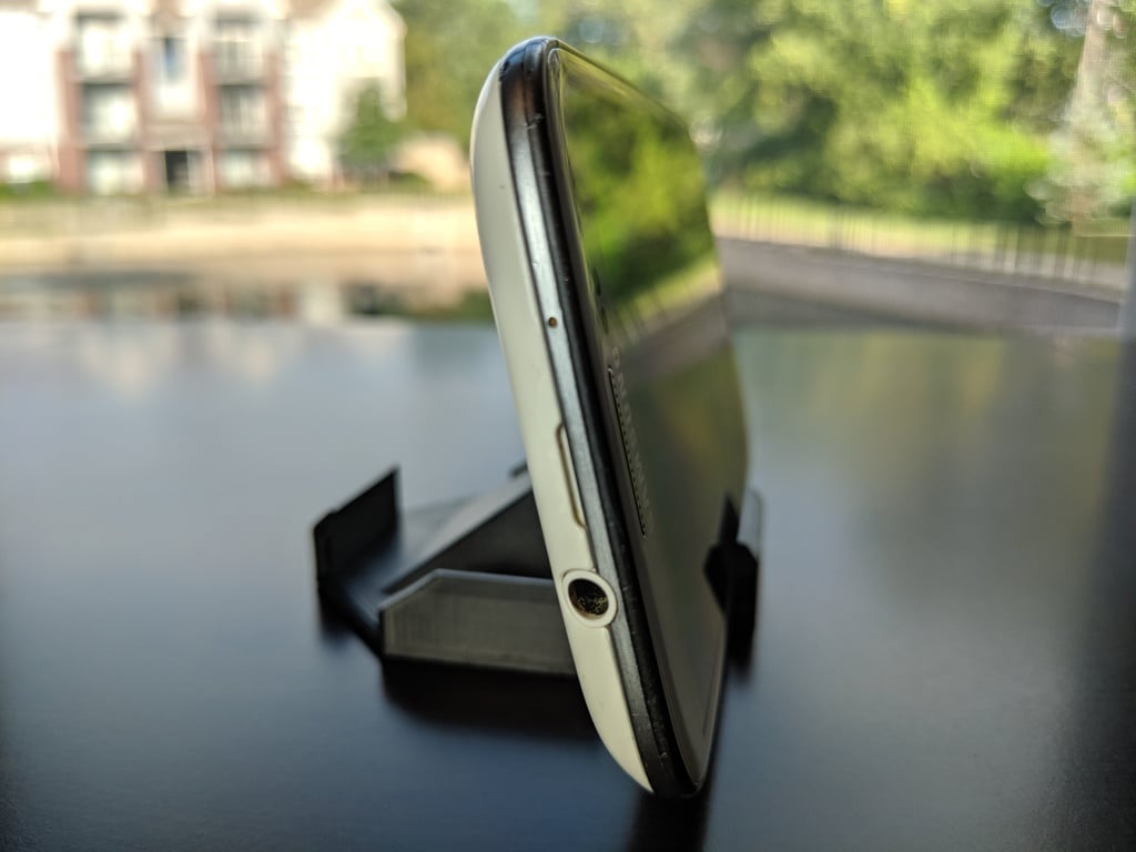 Een draagbare telefoonhouder met 4 verstelbare hoeken: 34°, 45°, 57° en 80°. Deze kleine, stevige en lichtgewicht standaard past op 99% van de telefoons, inclusief niet-volumineuze hoesjes (toegestane totale dikte is 10mm of .4in).