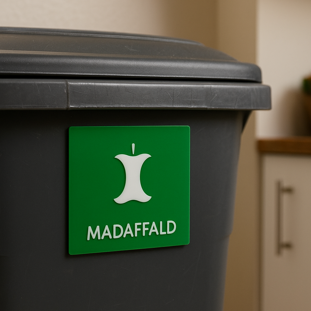 Geproduceerd in PLA-plastic met een duidelijk pictogram en tekst die het Deense sorteersysteem volgt.