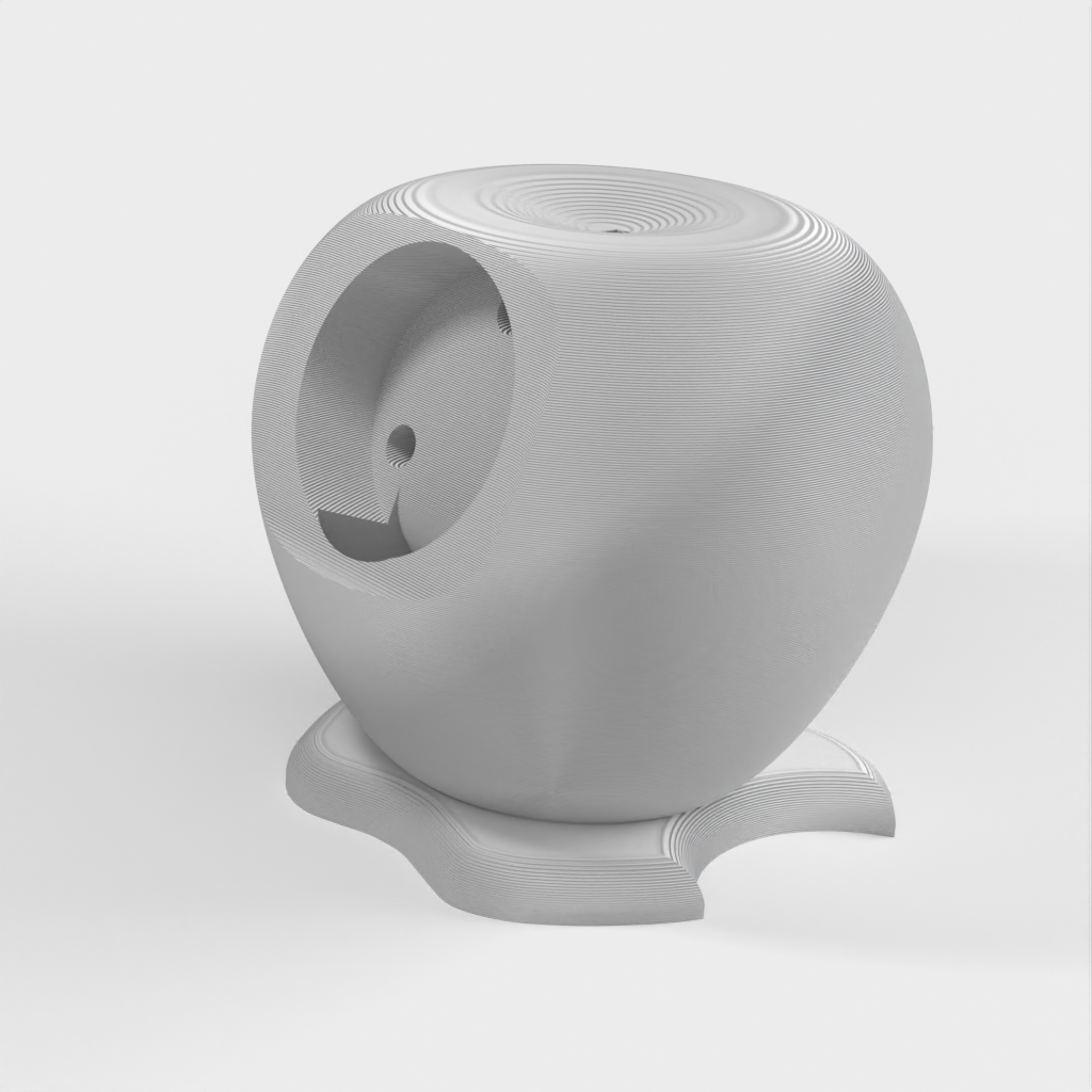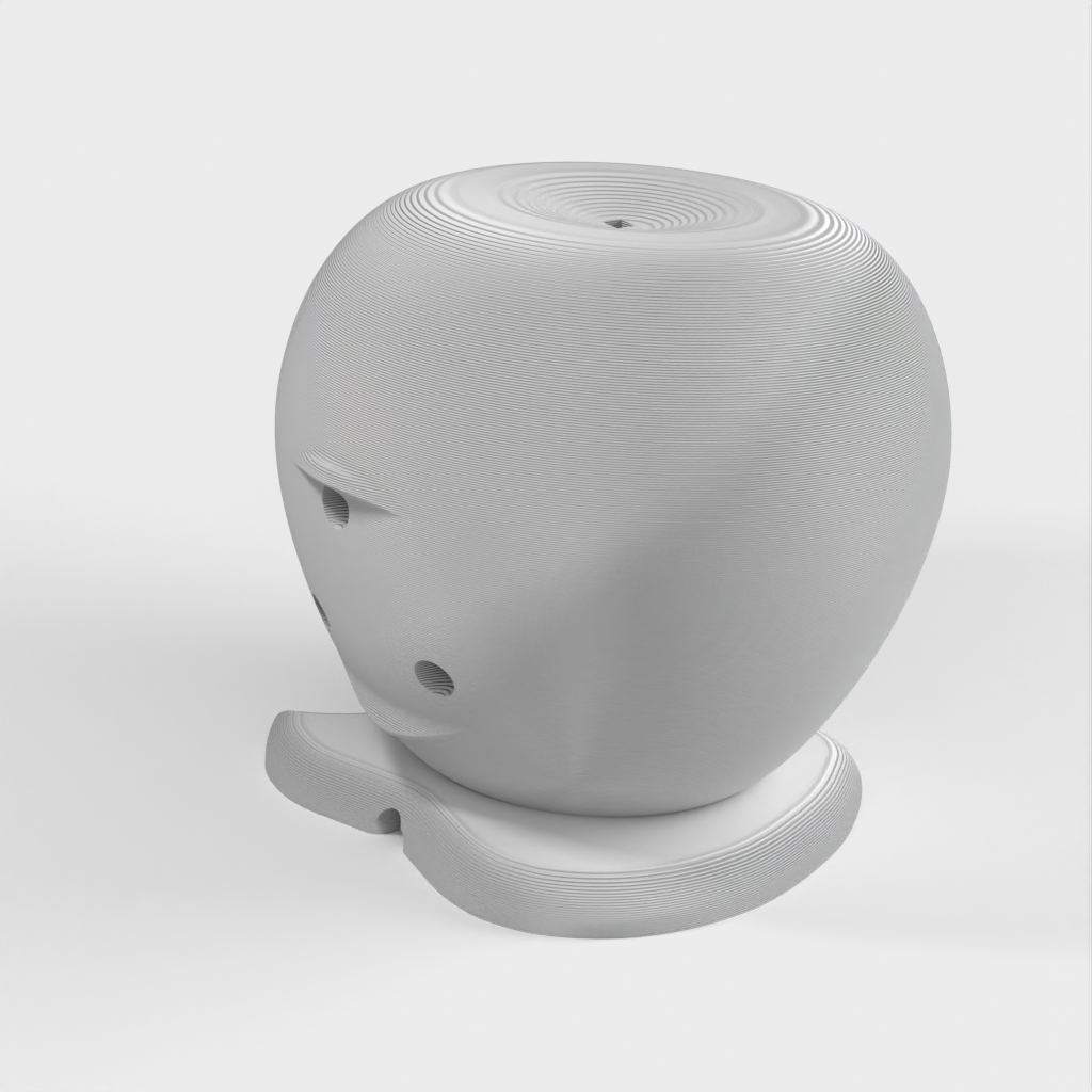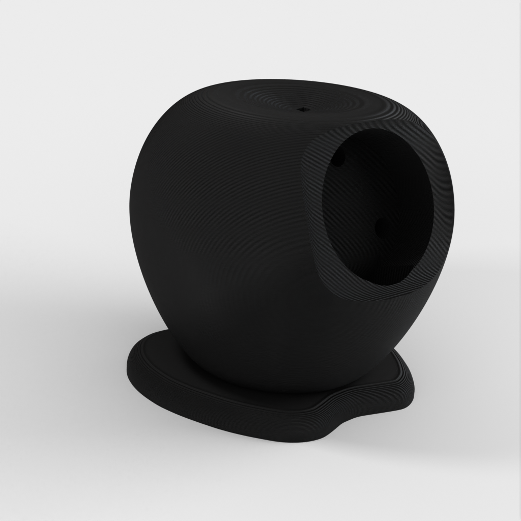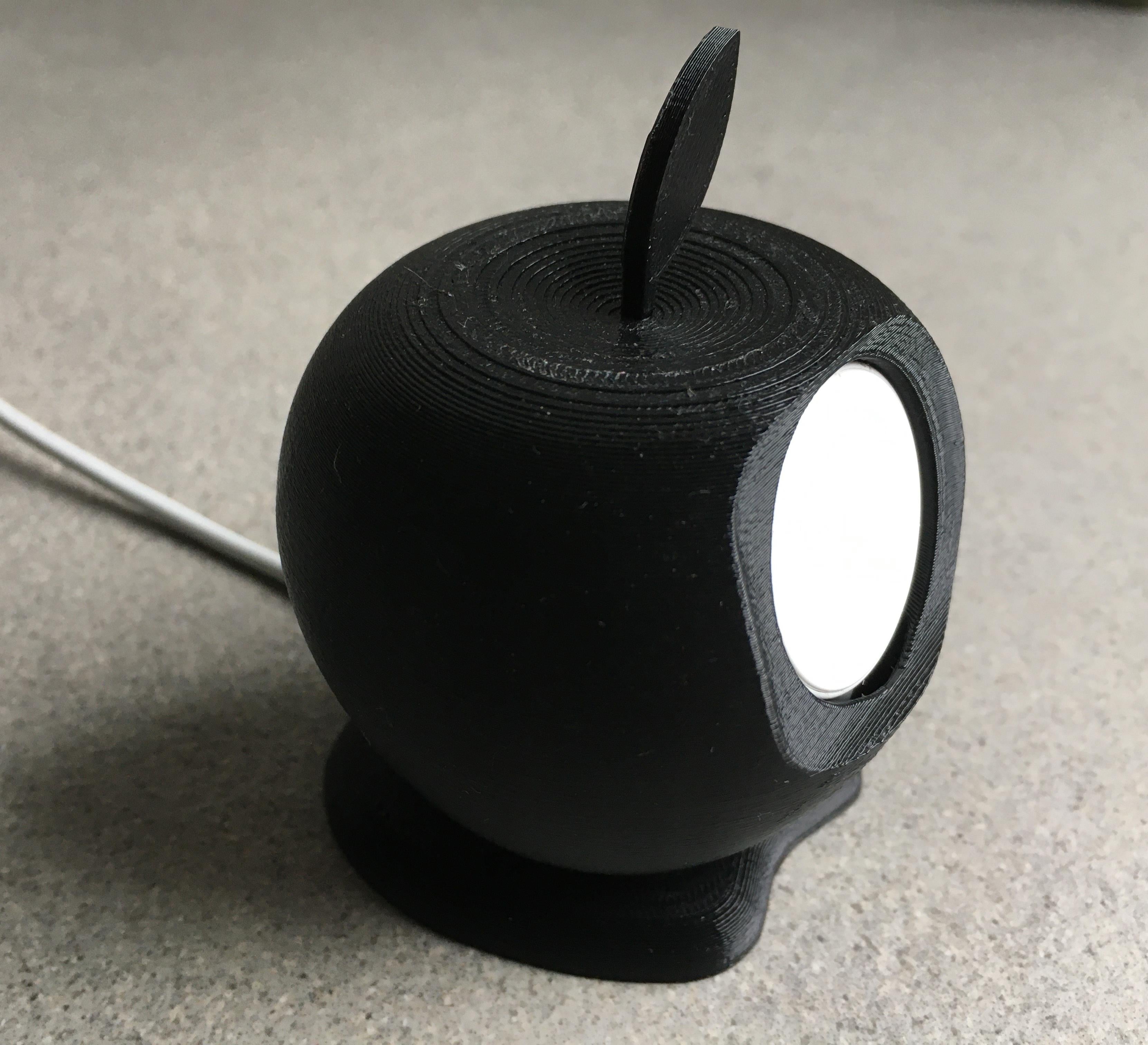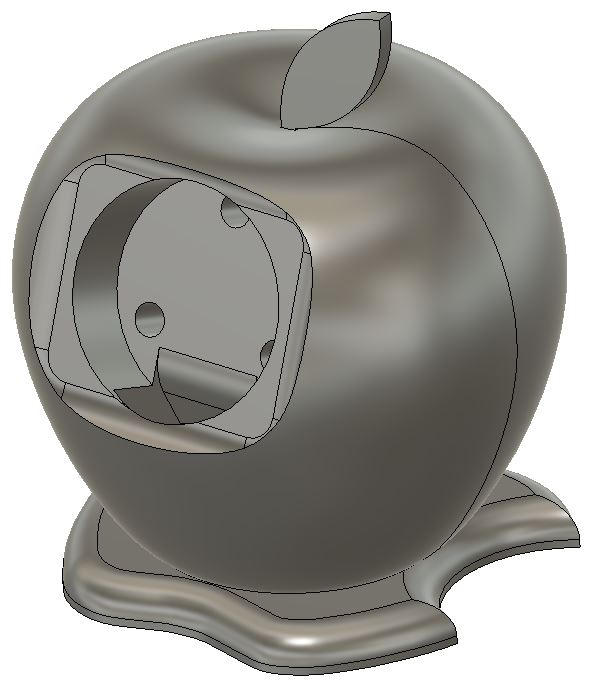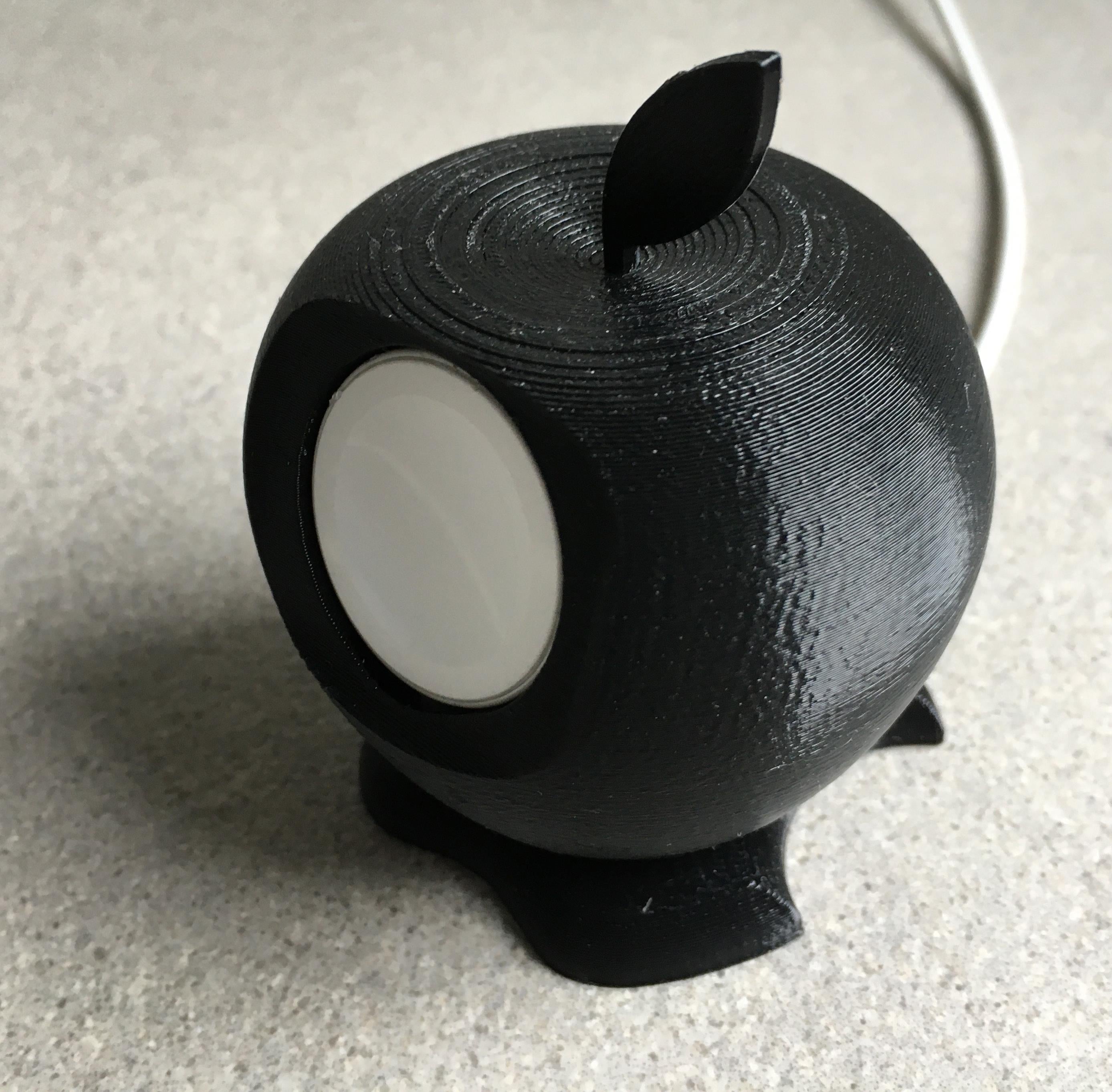 Oplaadstandaard voor Apple Watch (40 mm) ontworpen in de vorm van het Apple logo. De kabel wordt door het gat gevoerd en de oplader klikt vast. Het model heeft gaten aan de achterkant om de oplader eruit te schuiven als dat nodig is.