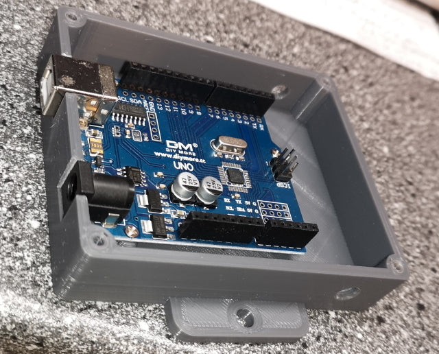Er is voldoende ruimte in de behuizing voor draden en andere kleine voorwerpen. Gebruik kleine zelftappende schroeven voor de arduino en het deksel.