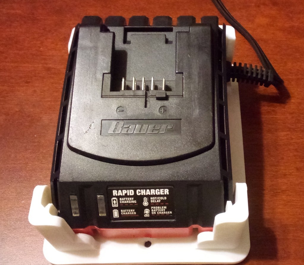 Dit is een beugel om een Bauer lader aan een muur, bank of plank te bevestigen. De Bauer lader heeft geen ingebouwde bevestiging, dus dit accessoire helpt je om je werkruimte georganiseerd en opgeruimd te houden.