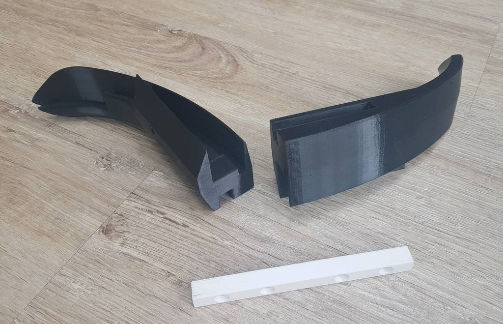 Omdat de bumper te groot is voor mijn printer om hem in één stuk te printen, is hij verdeeld in delen en een middenstuk om de boel aan elkaar te vergrendelen.