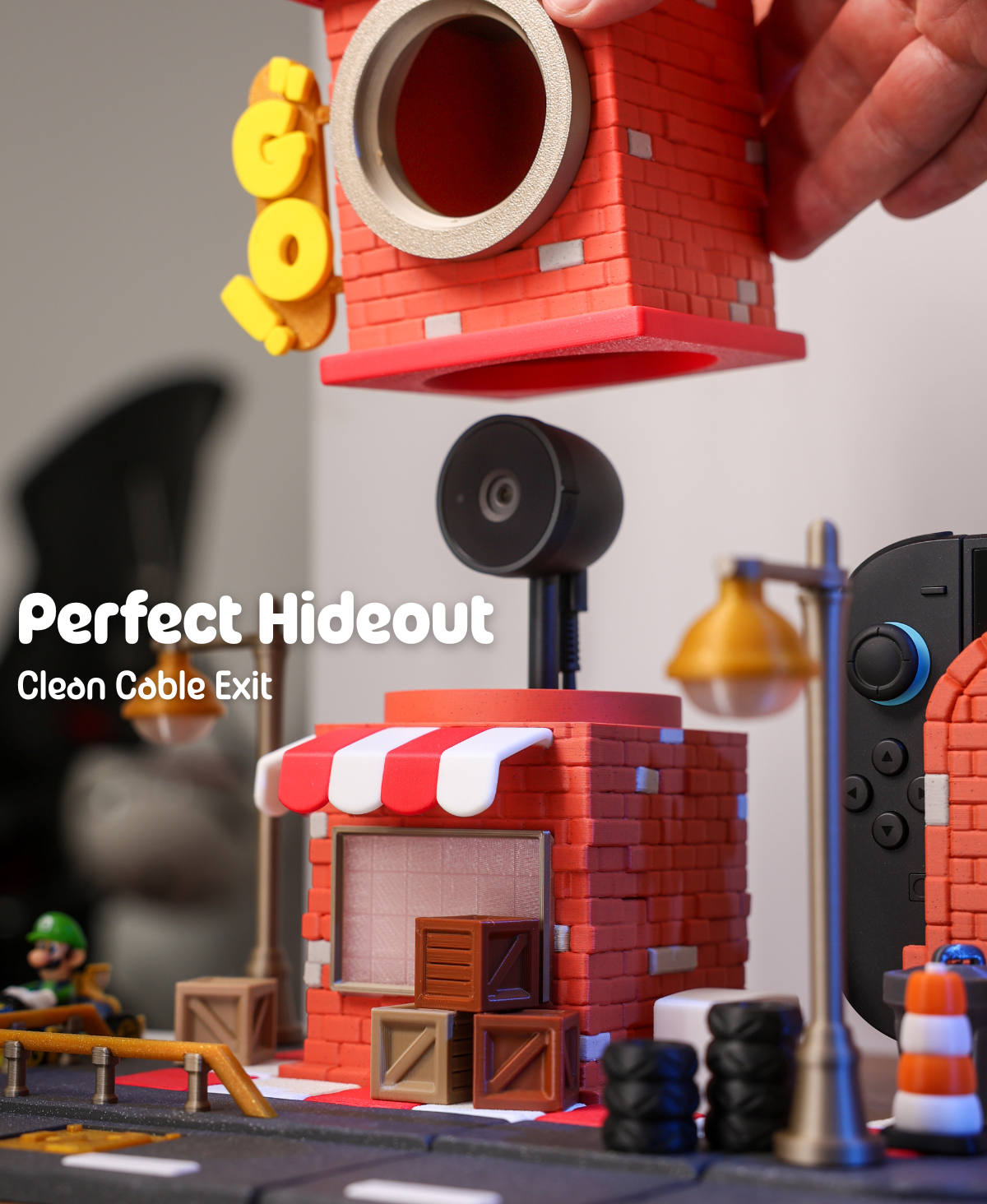 Deze Camera Toren, onderdeel van de Turbo District collectie, beveiligt uw Nintendo Switch 2 Camera. U kunt de privacyfunctie eenvoudig activeren door de tweede verdieping van de toren te draaien en de camera te verbergen. Hij beschikt over discrete kabelbeheer en een bovenplatform dat ideaal is om een amiibo-figuur in uw gaming-setup tentoon te stellen.