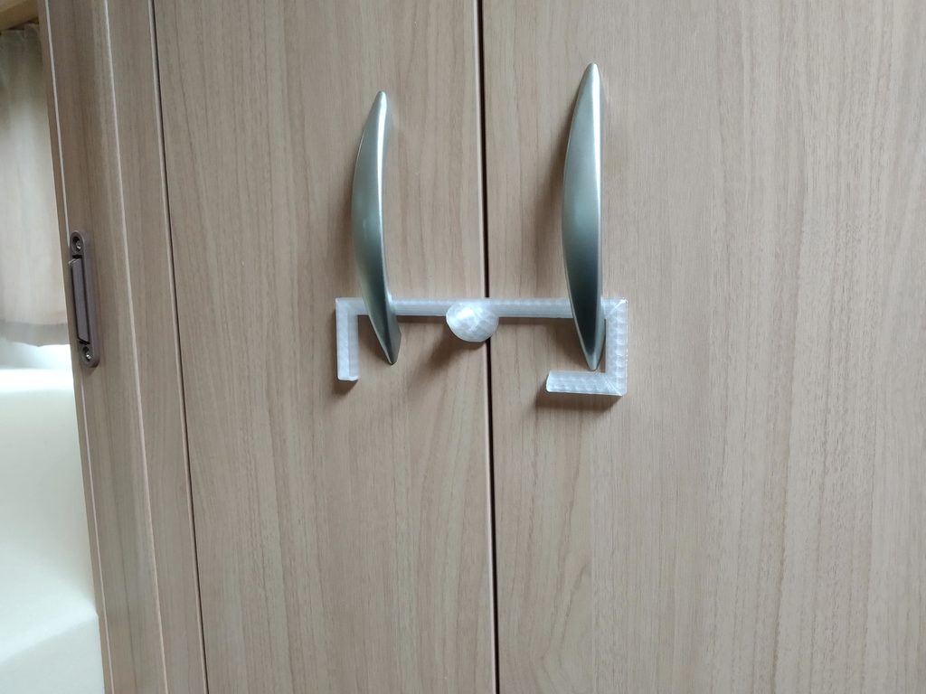 Een klein slot om kastdeurtjes gesloten te houden tijdens het vervoer in je caravan. Als de kastdeurtjes van je caravan vaak opengaan tijdens het reizen, kan dit een handige oplossing zijn. Het is een eenvoudig haakje dat over beide deurhendels klikt en voorkomt dat ze opengaan.