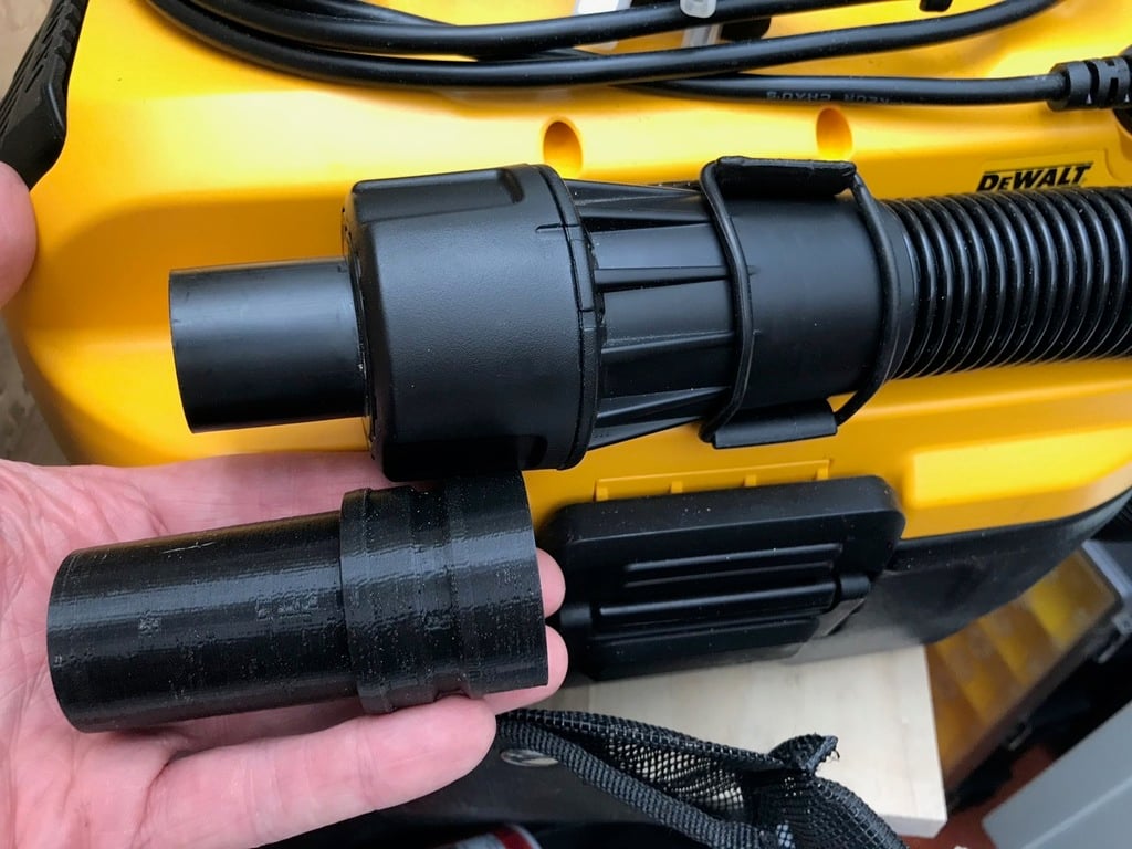 Een adapter van DeWalt Airlock naar 35 mm. Dit product is ontworpen om uw DeWalt DCV584L stofzuiger aan te sluiten op uw Festool geleiderail-invalzaag. De standaard Airlock-adapter eindigt in een 32 mm-tap die net rond rammelt in de 35 mm-poort van de zaag, maar deze adapter lost het probleem effectief op.