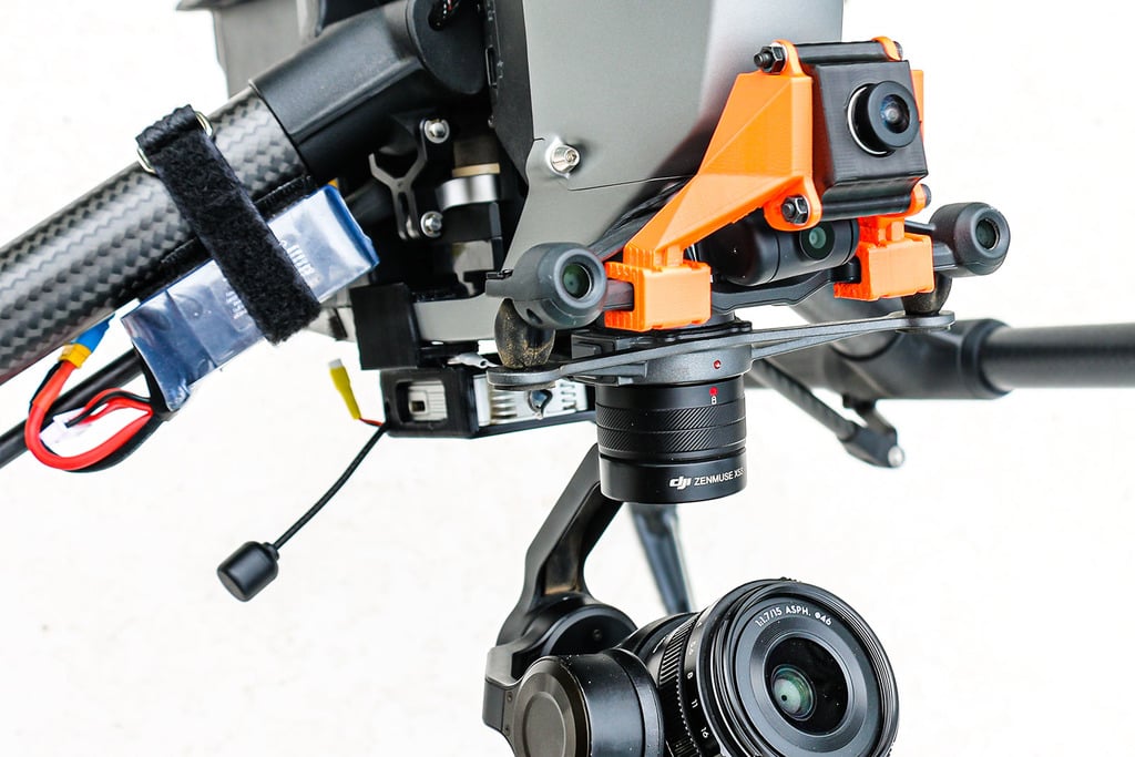 Verbeterde veiligheid is geïntegreerd via bouten die de cardanische ophanging vasthouden, evenals grijparmen die de Inspire-body omsluiten. Een oppervlak biedt de mogelijkheid voor extra klittenbandbevestiging, indien gewenst, en een handige batterijriem is inbegrepen voor extra bevestiging van componenten. Er is ook een versie van de camera-armen die de camera hoger optilt, weg van de cardanische ophanging, als u een langere kabel (20 cm) gebruikt.