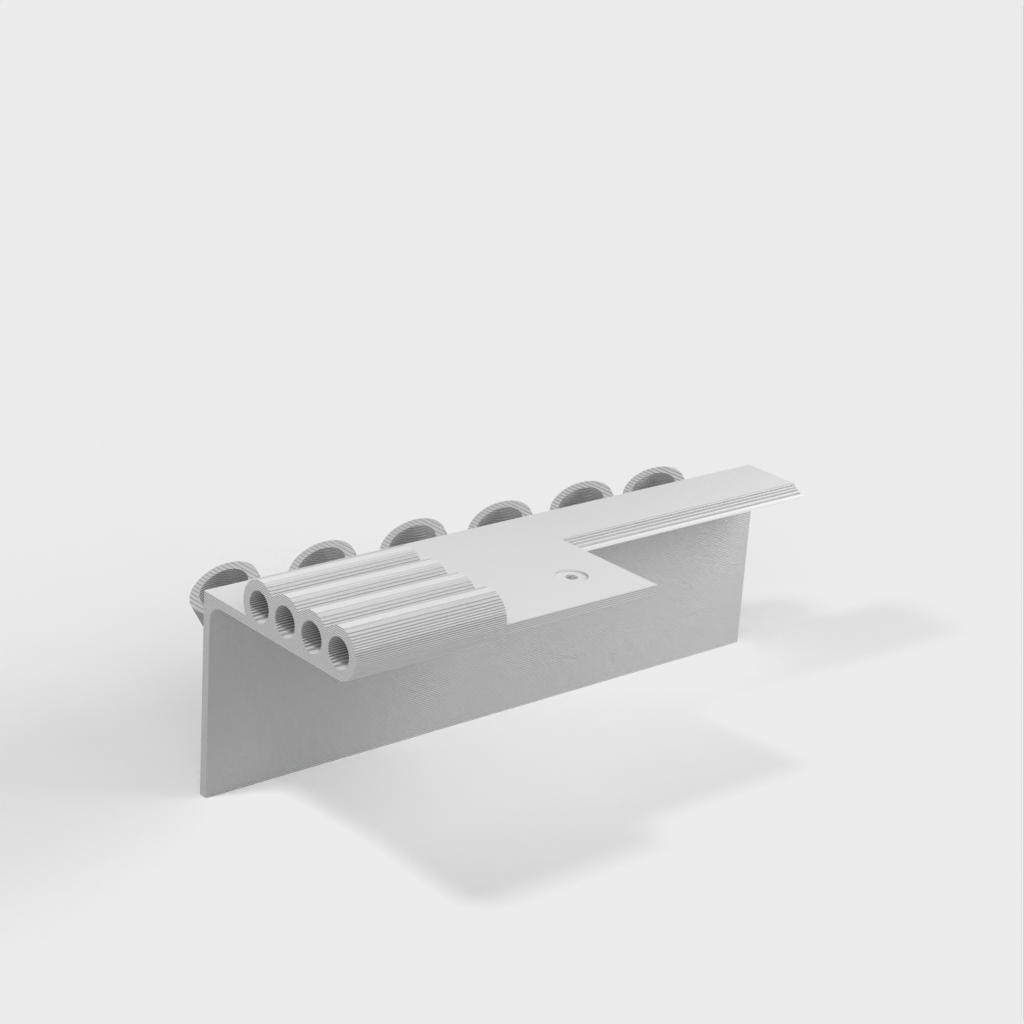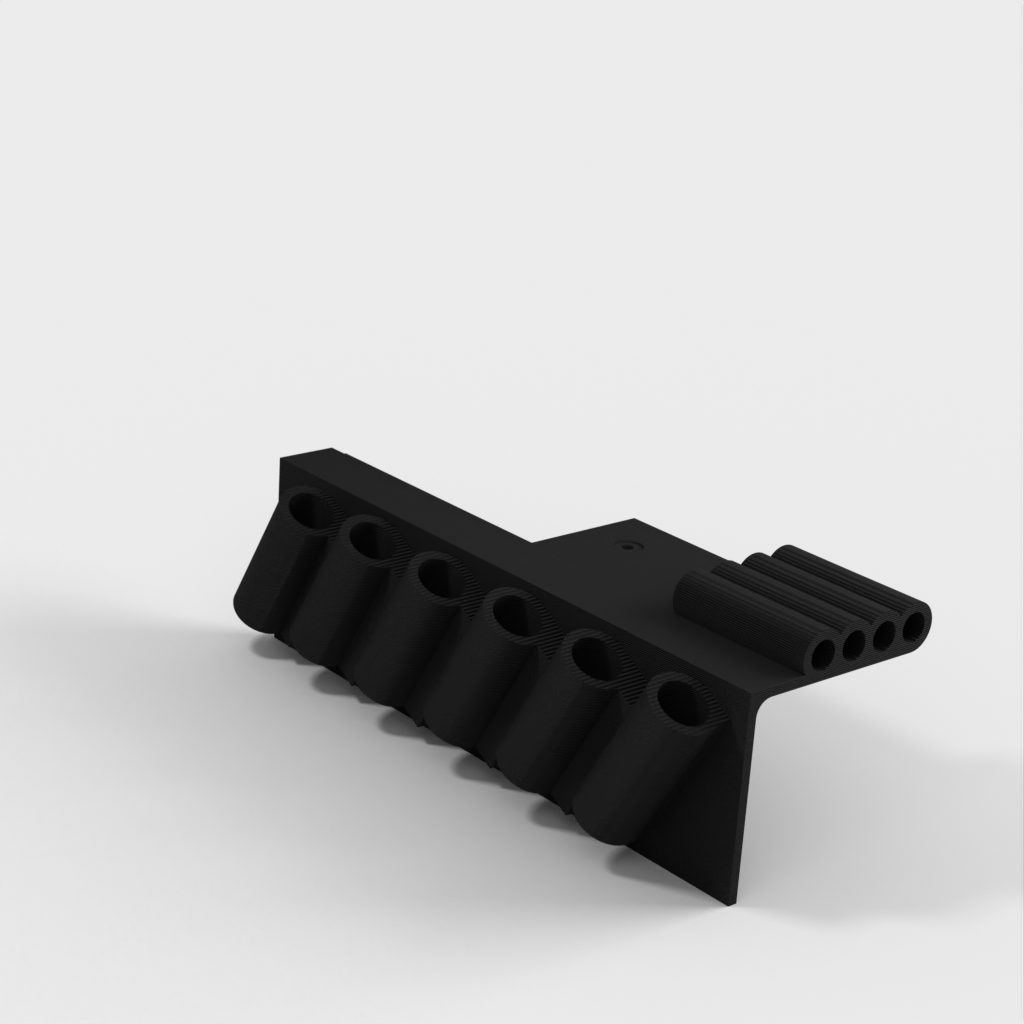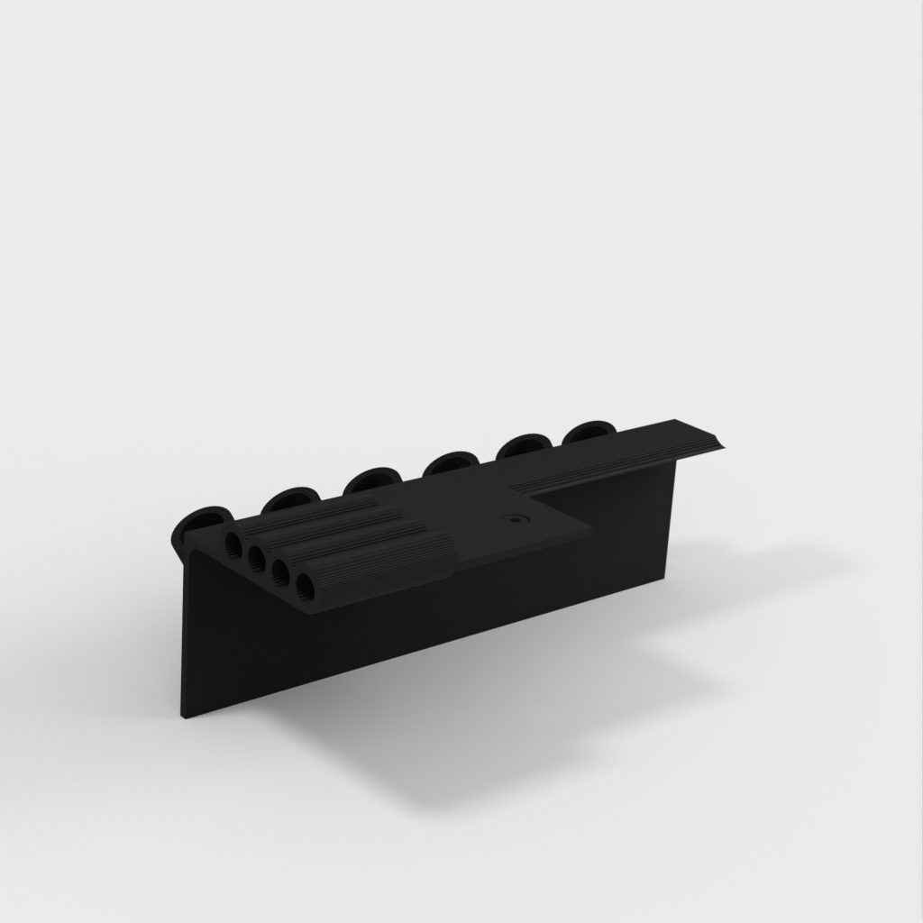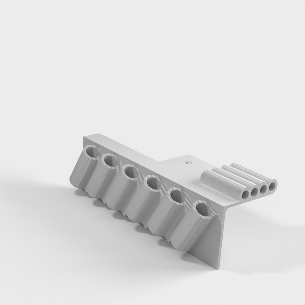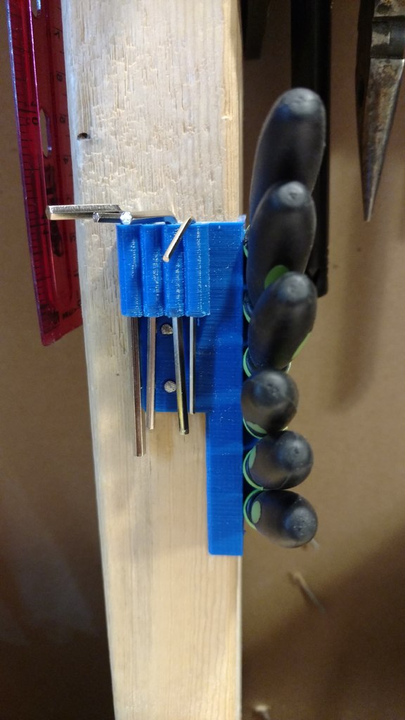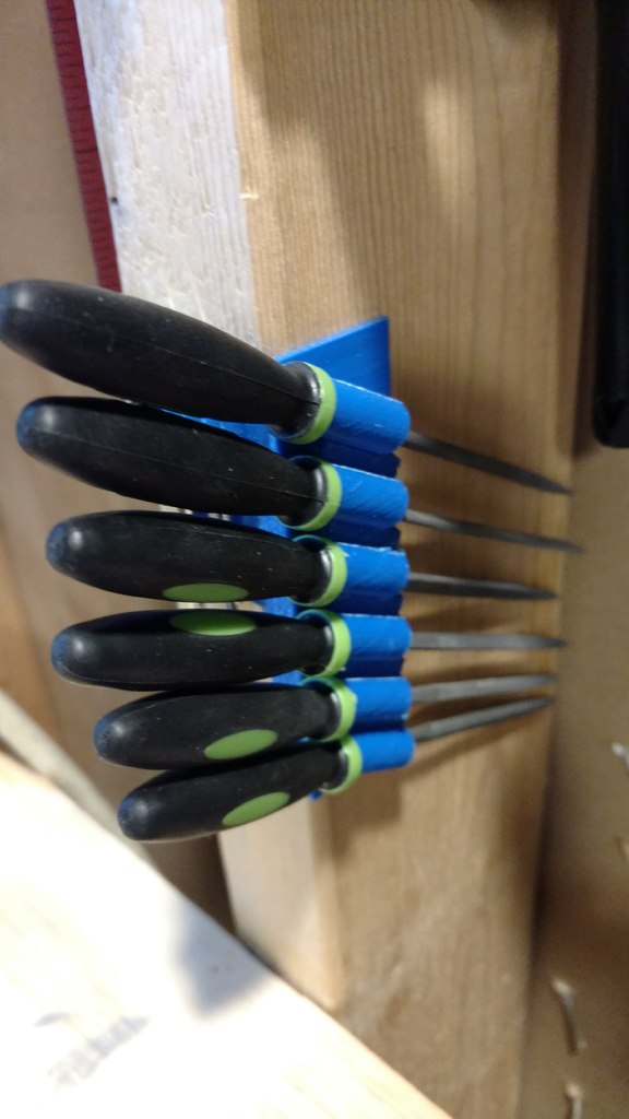 Gereedschapshouder met stiftbevestiging ontworpen voor 6-delige naaldvijl (zoals deze: http://a.co/iLnJ8kb) of vergelijkbaar gereedschap en 4 inbussleutels/moersleutels, bijvoorbeeld die bij de Anet A8 3D-printer. Zes sleuven zijn schuin en ver uit elkaar geplaatst om te voorkomen dat gereedschapshandgrepen tegen elkaar botsen. Twee verzonken spijkergaten voor bevestiging aan een muur.