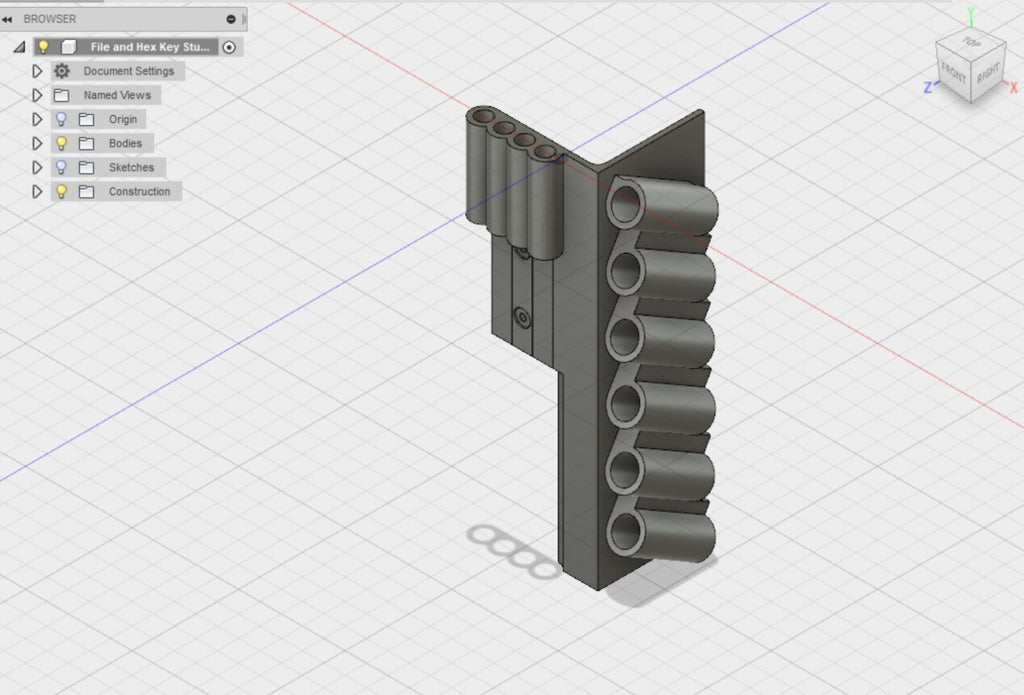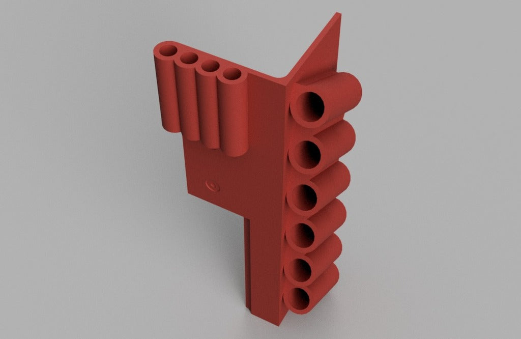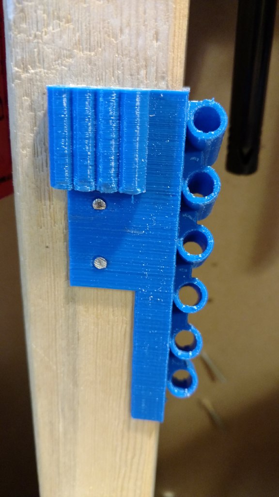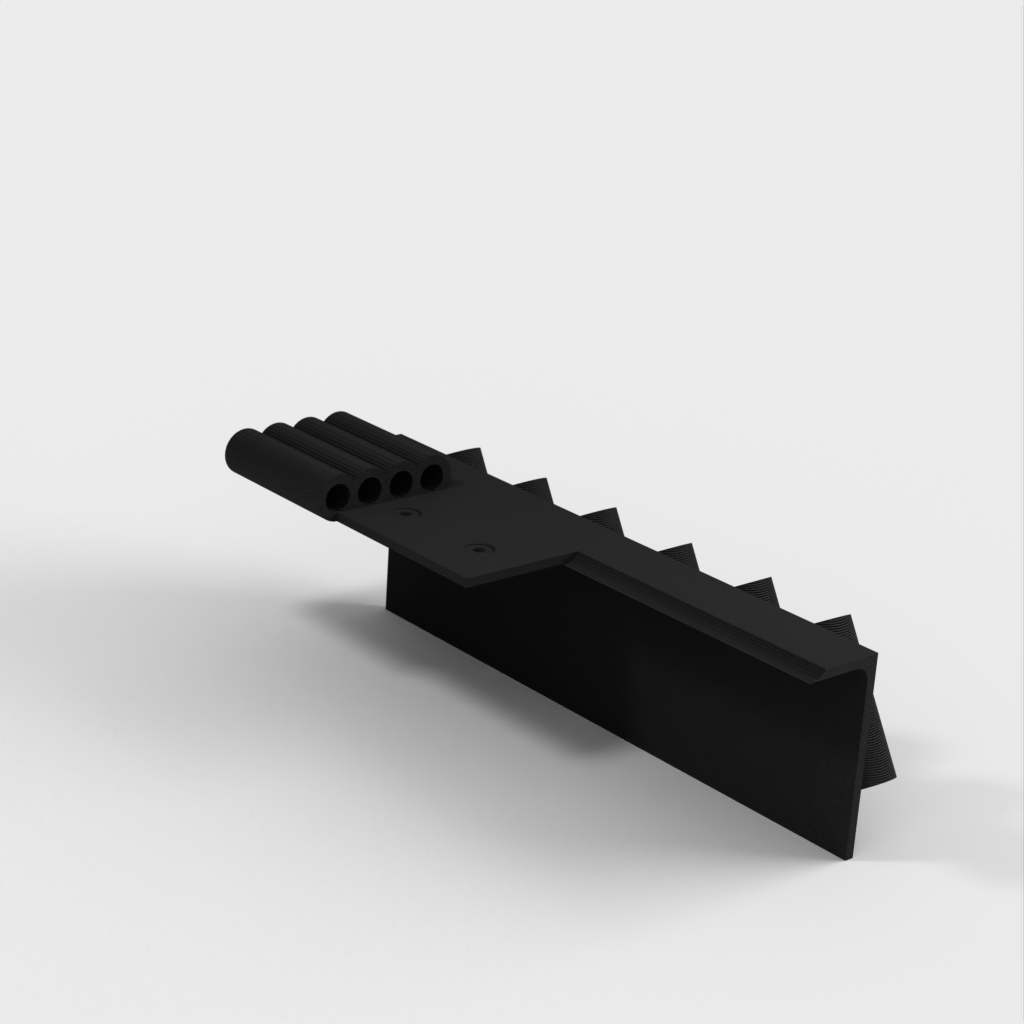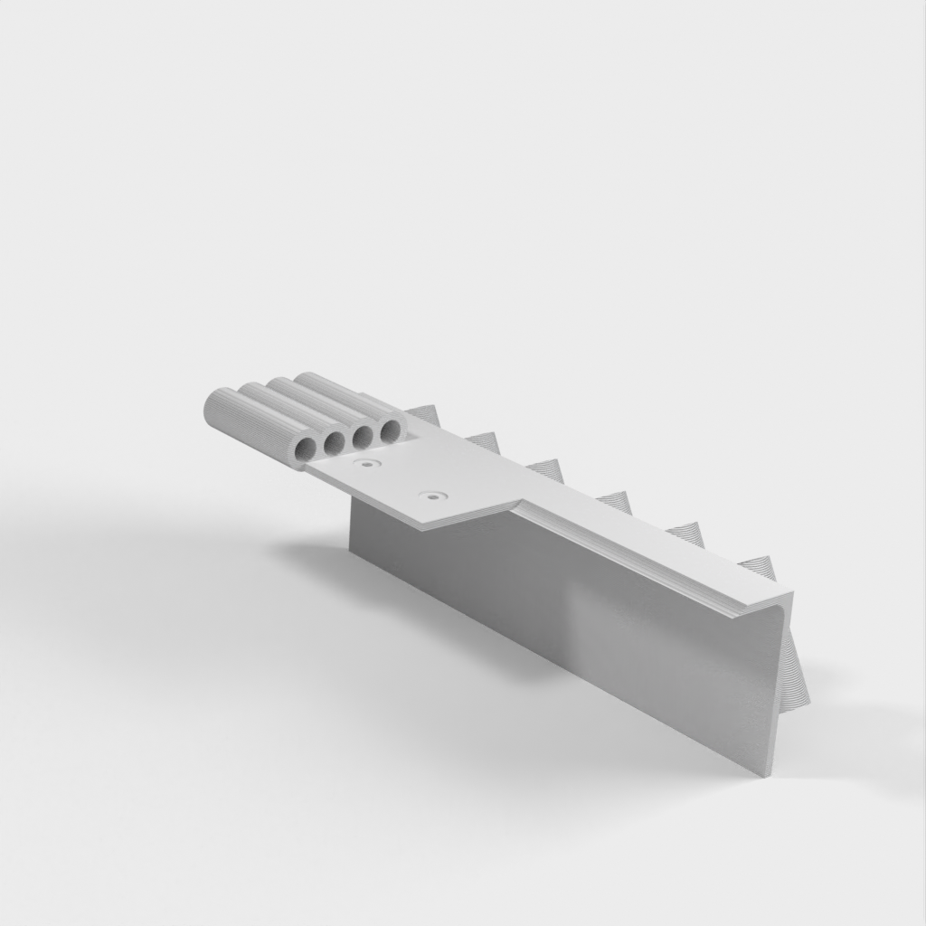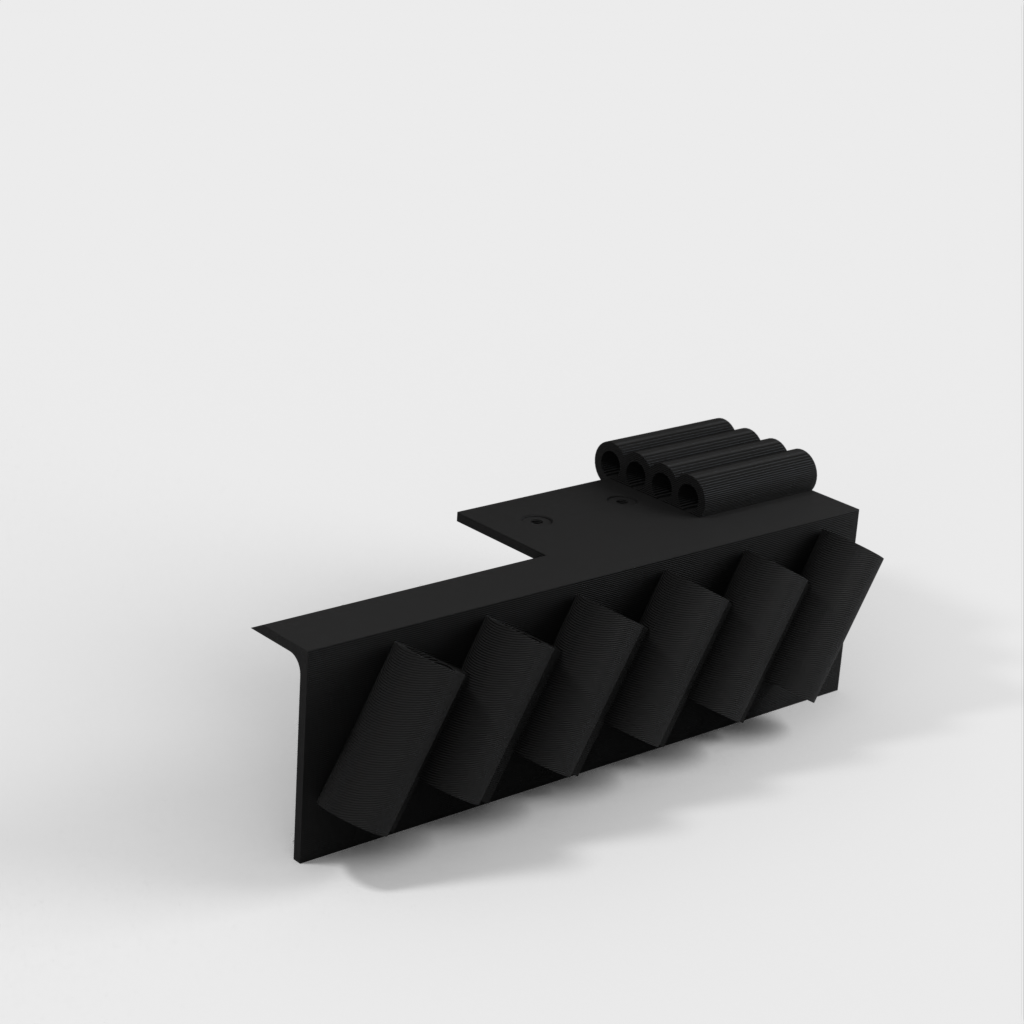 Gereedschapshouder met stiftbevestiging ontworpen voor 6-delige naaldvijl (zoals deze: http://a.co/iLnJ8kb) of vergelijkbaar gereedschap en 4 inbussleutels/moersleutels, bijvoorbeeld die bij de Anet A8 3D-printer. Zes sleuven zijn schuin en ver uit elkaar geplaatst om te voorkomen dat gereedschapshandgrepen tegen elkaar botsen. Twee verzonken spijkergaten voor bevestiging aan een muur.