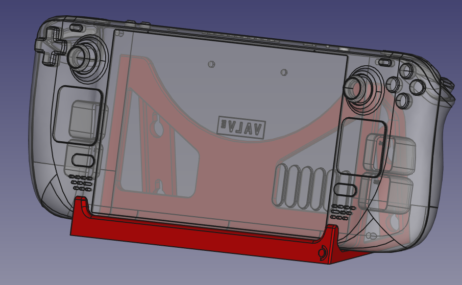 Dit is een eenvoudige ondersteuning voor de mobiele pc/console van Valve Steam Deck. Het kan ook functioneren als muurbeugel. Je kunt het Steam Deck-model vinden in de Valve Software Gitlab-repository.