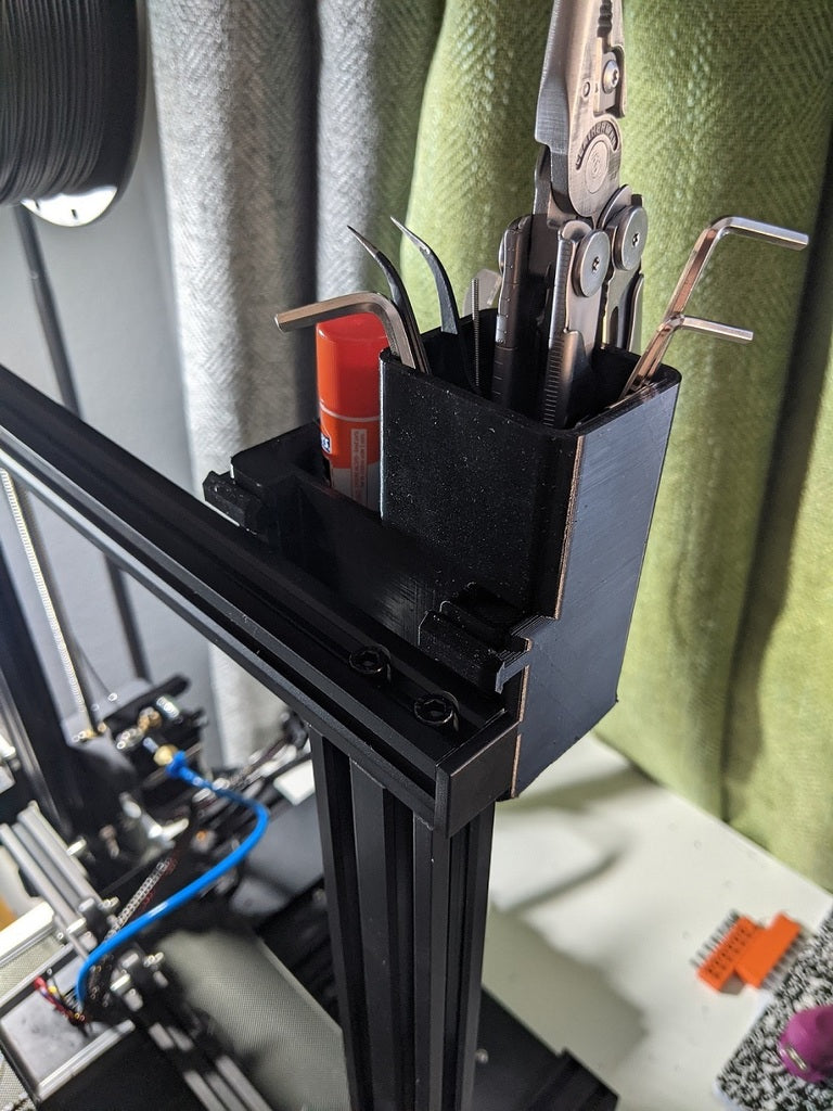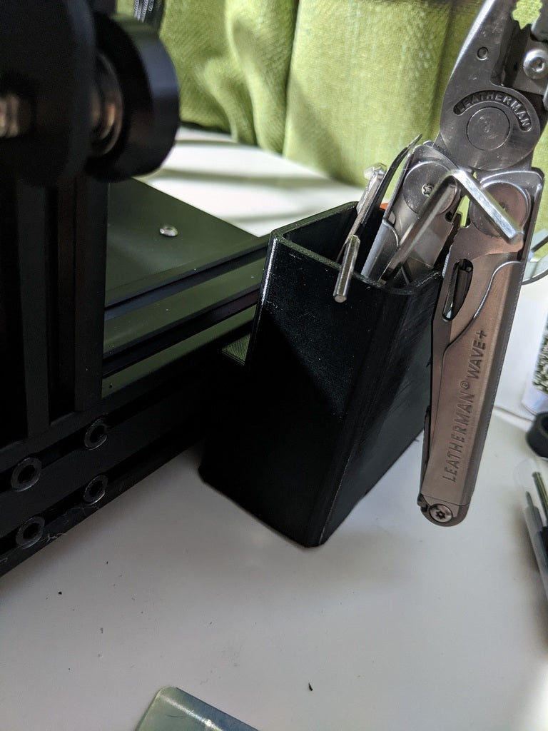 Verbeter uw 3D-printeropstelling met deze praktische gereedschapskist, speciaal ontworpen voor de Ender 3 V2. Deze slimme opbergoplossing past perfect op standaard aluminium profielen en kan eenvoudig aan de zijkant of bovenkant van uw printerframe worden gemonteerd. Het biedt voldoende ruimte om essentiële gereedschappen op te bergen, zoals een Leatherman Wave+ en andere kleine accessoires, zodat u ze altijd bij de hand hebt. De gereedschapskist helpt om uw werkruimte georganiseerd en efficiënt te houden, wat uw workflow optimaliseert. Voor een optimale duurzaamheid kan deze met voordeel in PETG worden geproduceerd.
