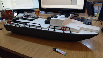 De Florina RC-boot is een geavanceerd radiografisch bestuurd model, gemaakt om spannende en snelle ervaringen op het water te bieden. Deze robuuste boot is gemaakt van duurzaam Komatex (PVC), wat zorgt voor een lichte maar stevige romp. De romp is zorgvuldig afgedicht en behandeld met een rubberachtige verf die extra bescherming biedt en de boot zeer waterdicht maakt, klaar voor actie op het meer of in de vijver.