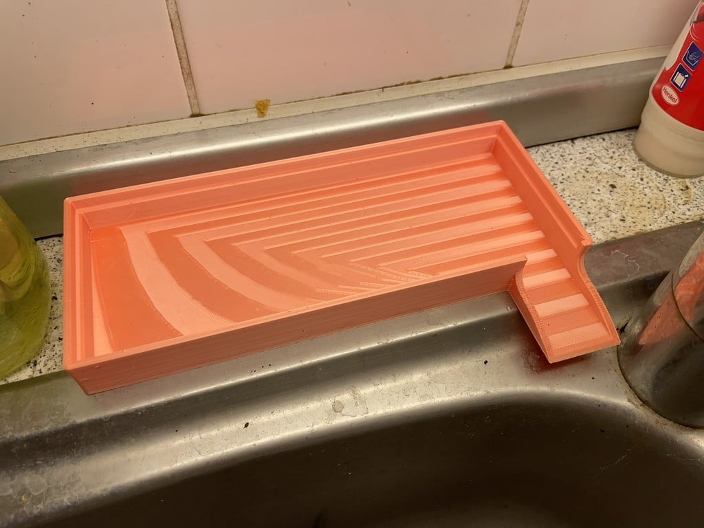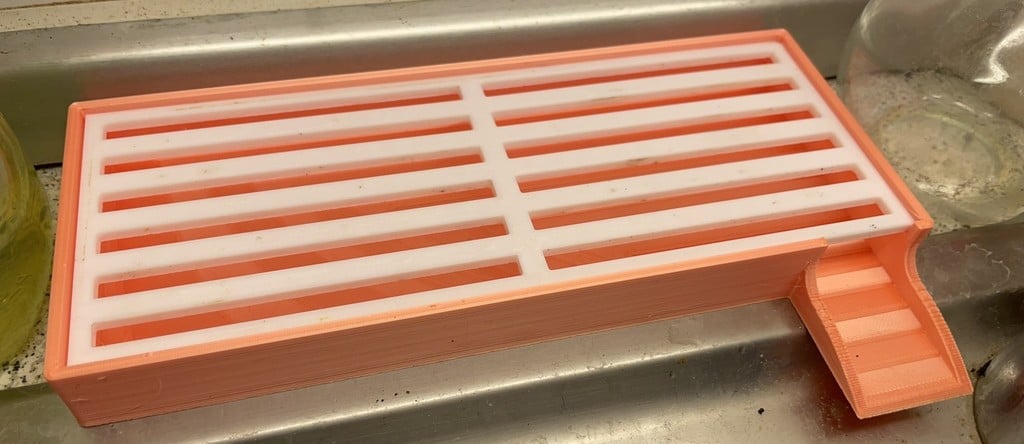 De afmetingen van de organizer zijn goed doordacht om in de meeste standaard gootstenen te passen. De basis meet 8 cm x 20 cm x 2 cm en bevat een afvoer van 3,5 cm lang en 3 cm breed. Het rek zelf meet 7,4 cm x 19,4 cm en de flessenhouder heeft een hoogte van 13,8 cm, waardoor er voldoende ruimte is voor zelfs hogere flessen.