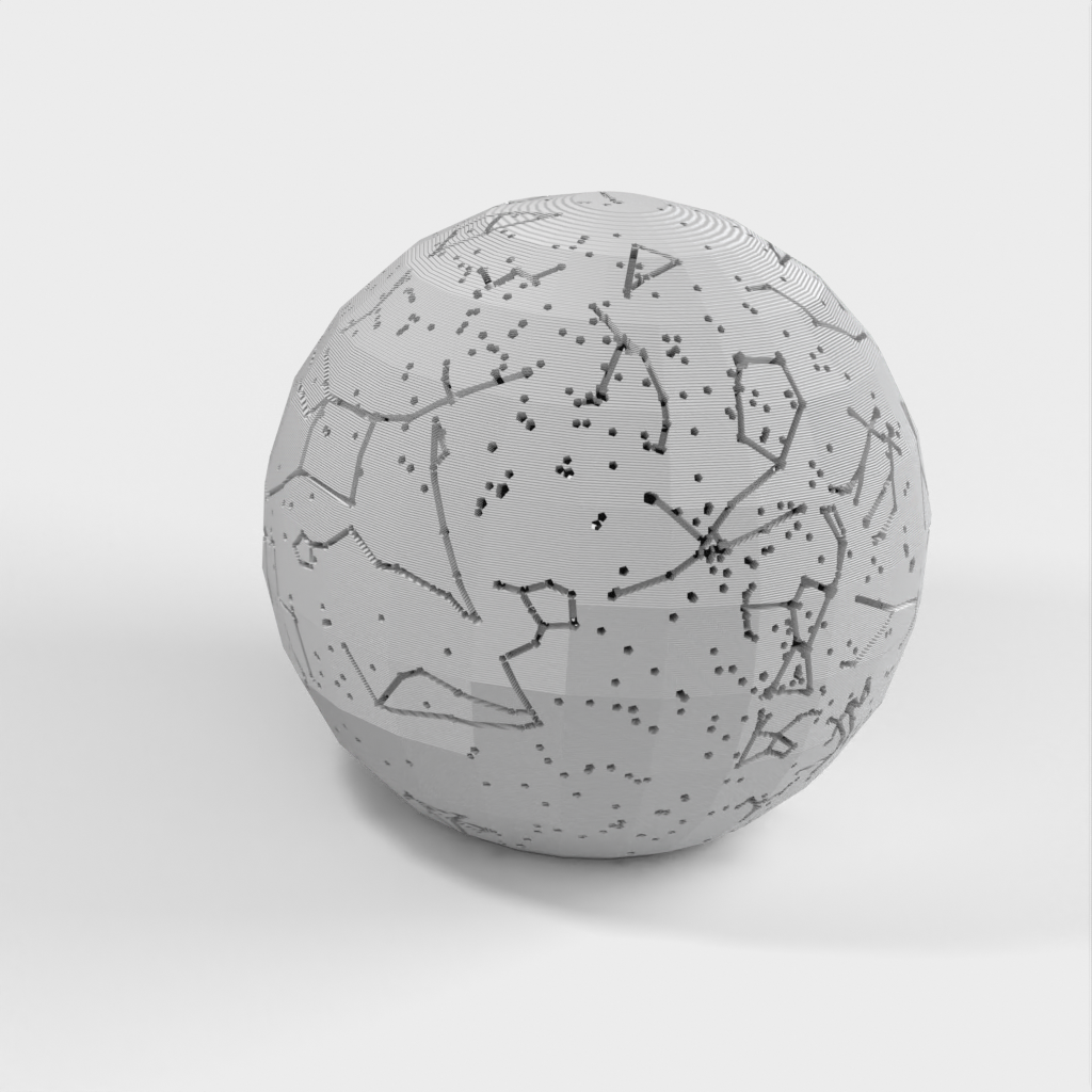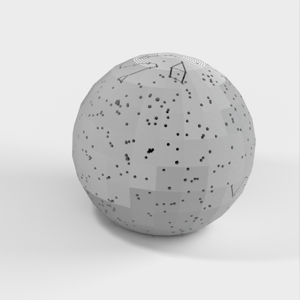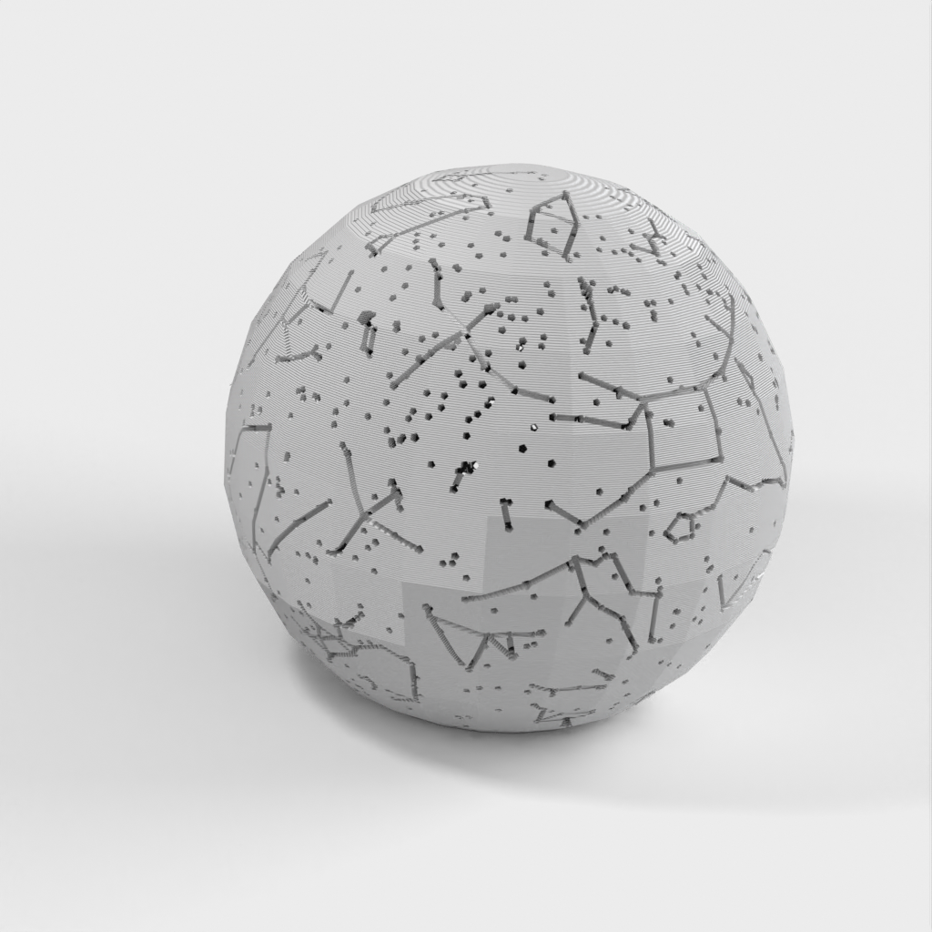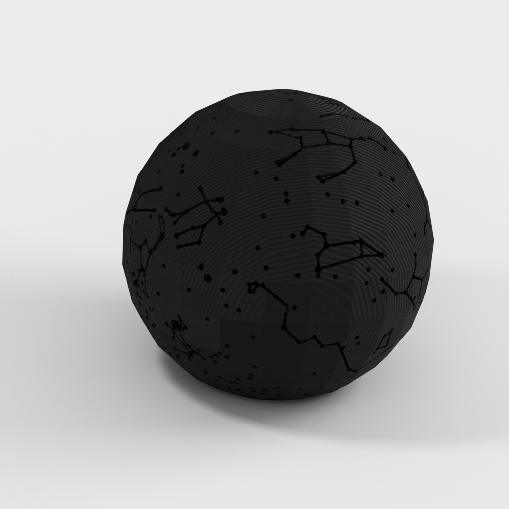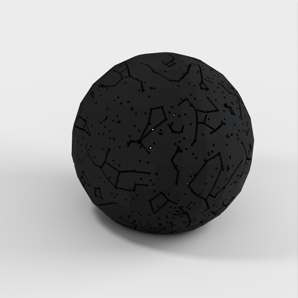 Dit product is een uitbreiding op de Celestial Sphere-modellen en kan STL-bestanden voor een hemelbol genereren. Met Openscad kun je veel parameters wijzigen en een 3D-model van de hemelbol maken, dat meer dan 1700 van de helderste sterren en tot 50 sterrenbeelden kan bevatten. Het model bevat ook plannen voor een equatoriale montering, compleet met voorziening voor LED-verlichting in de bol.