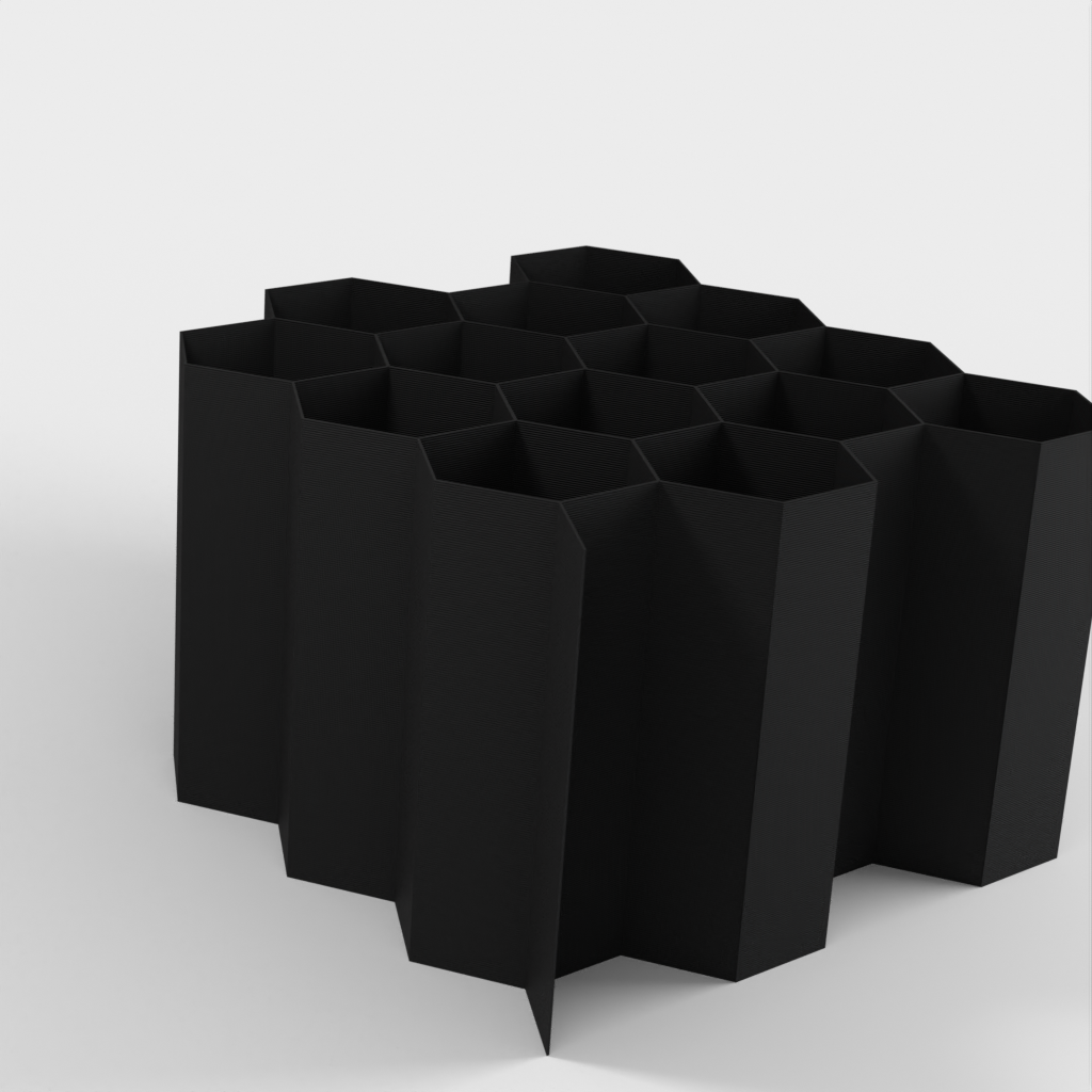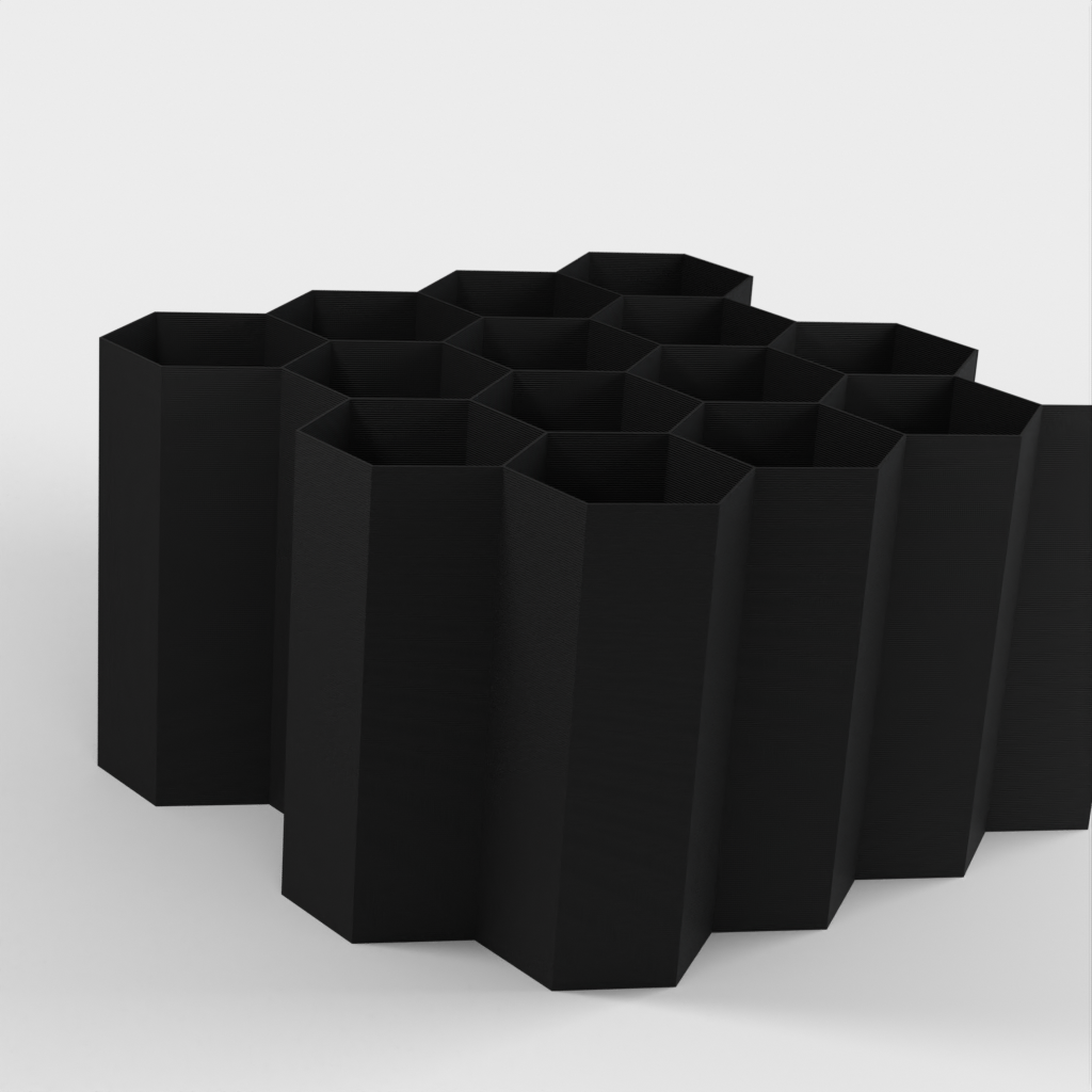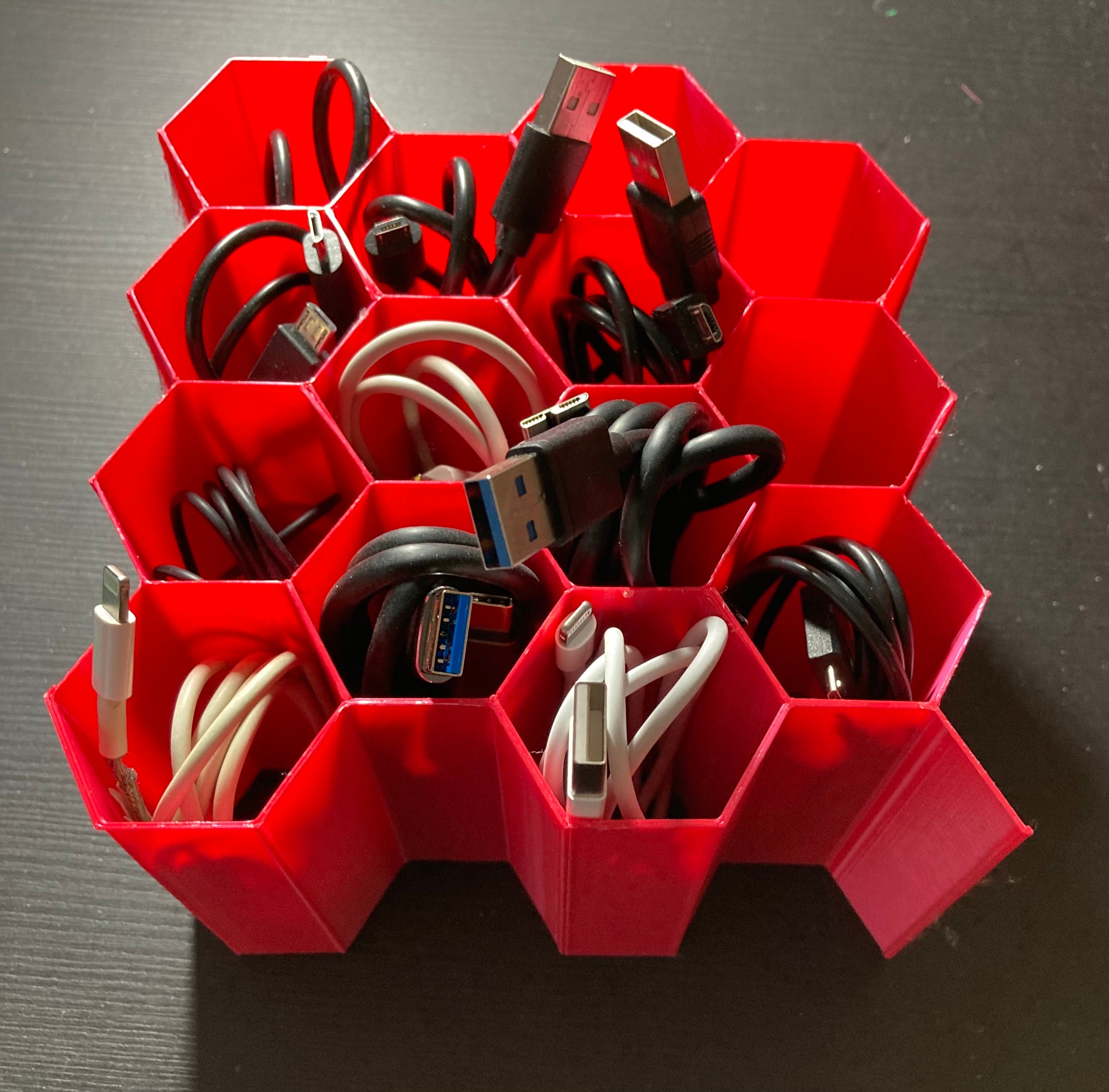 De Hex Cable Organiser is een modulair kabelopbergsysteem dat kabels snel vindt en opbergt zonder dat ze in de war raken. Kabels kunnen netjes worden opgeborgen in de zeshoekige sleuven. Er kunnen eenvoudig meer kabelopbergruimtes worden toegevoegd.