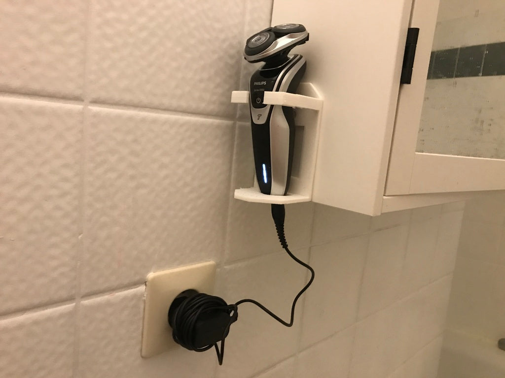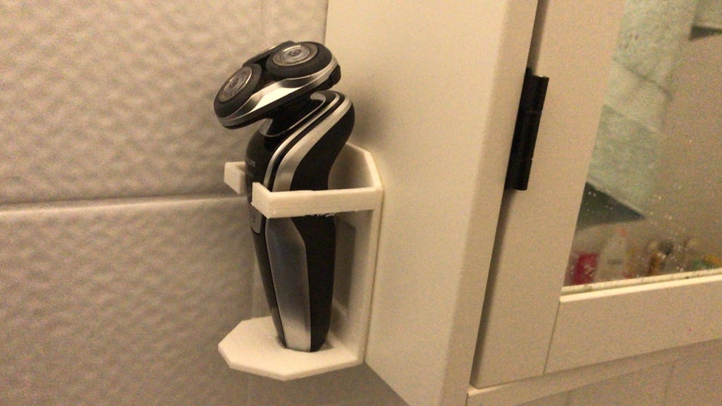 Deze kleine houder voor de Philips Series 5000 kan aan de muur worden geschroefd of gelijmd (niet meegeleverd). Aan de onderkant zit een gat voor de oplaadkabel, waardoor je je scheerapparaat kunt opladen terwijl het in de houder zit.