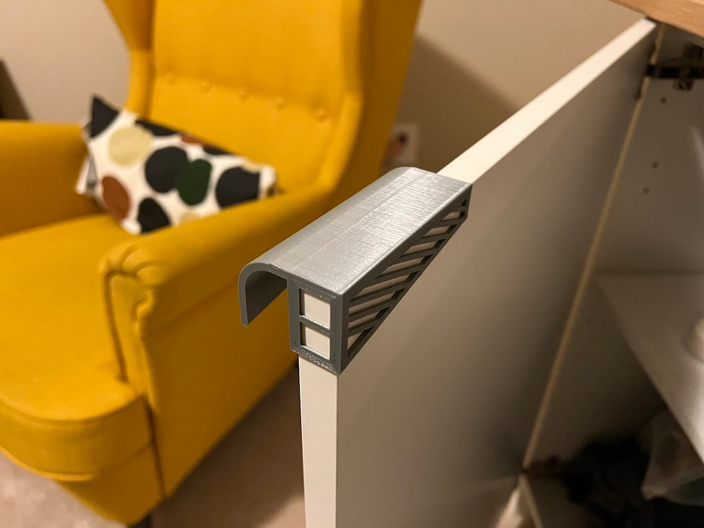 Dit product is een kastgreep, ontworpen om te passen op Ikea KNOXHULT kastdeuren die 16,4 mm dik zijn. De handgrepen hebben geen boringen of gaten nodig, omdat ze zijn ontworpen om door wrijving strak op de kastdeur te passen. Als je een strakkere pasvorm wilt, kun je dubbelzijdige tape aanbrengen of een stuk dik papier plaatsen. Je kunt de kant "verwisselen" en ze verticaal in plaats van horizontaal gebruiken.