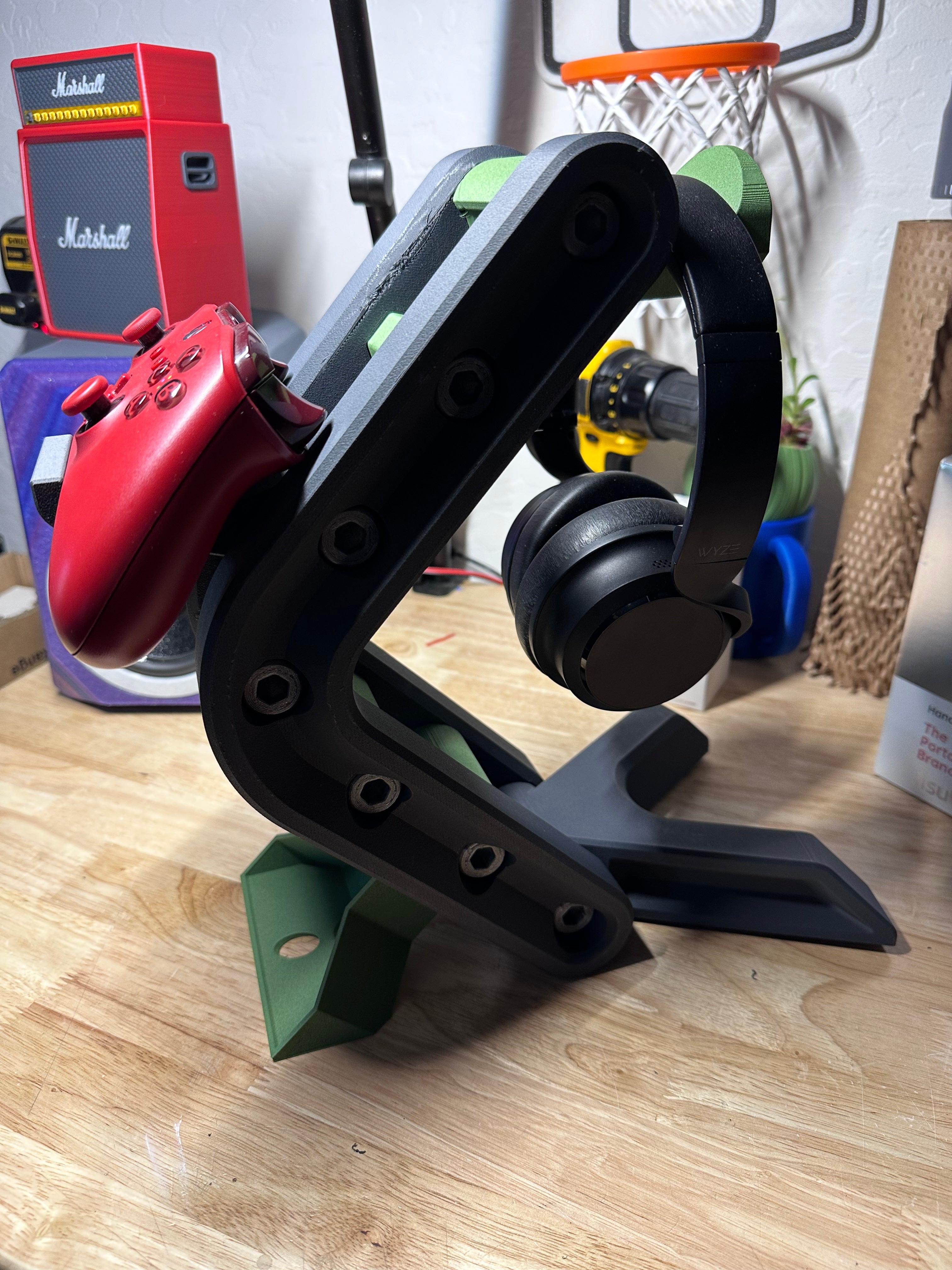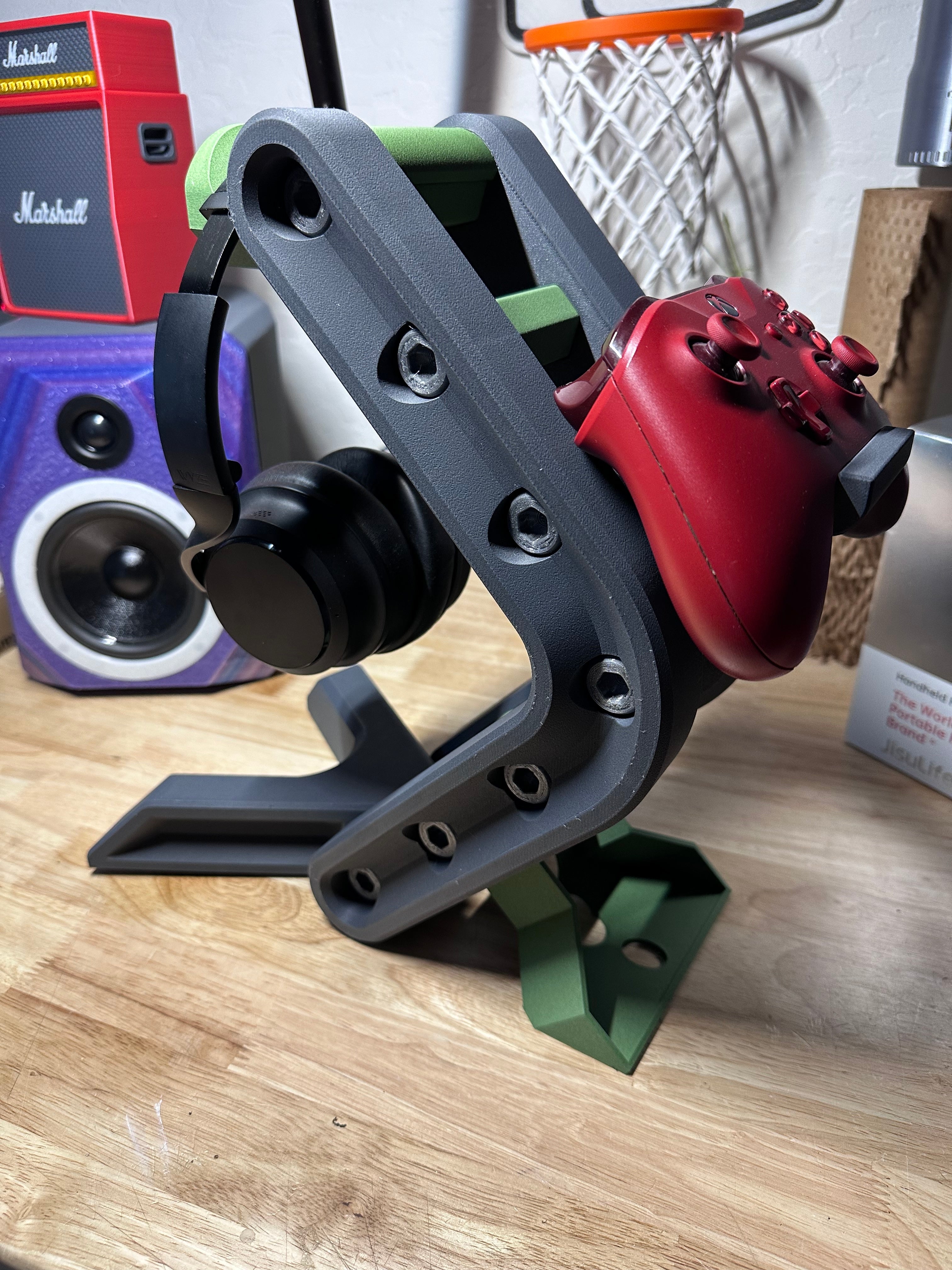 De hoofdtelefoonstandaard is ontworpen voor meerdere headsets, zodat u eenvoudig uw hele collectie kunt ophangen. Daarnaast bevat het ontwerp een praktische controllerhouder, die naar behoefte kan worden uitgebreid door meer apparaten toe te voegen. Dit maakt het een veelzijdige oplossing die kan worden aangepast aan uw specifieke opstelling en uw ruimte opgeruimd kan houden.