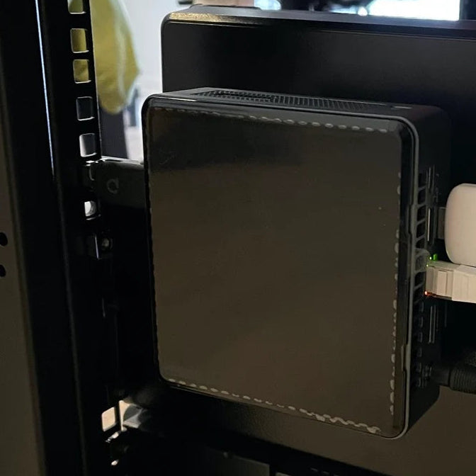 Beugel voor rackmontage van uw Intel NUC aan de zijkant van een standaard 19" rack. De achterplaat is dun genoeg om met de meegeleverde bouten op de NUC te worden gemonteerd.
