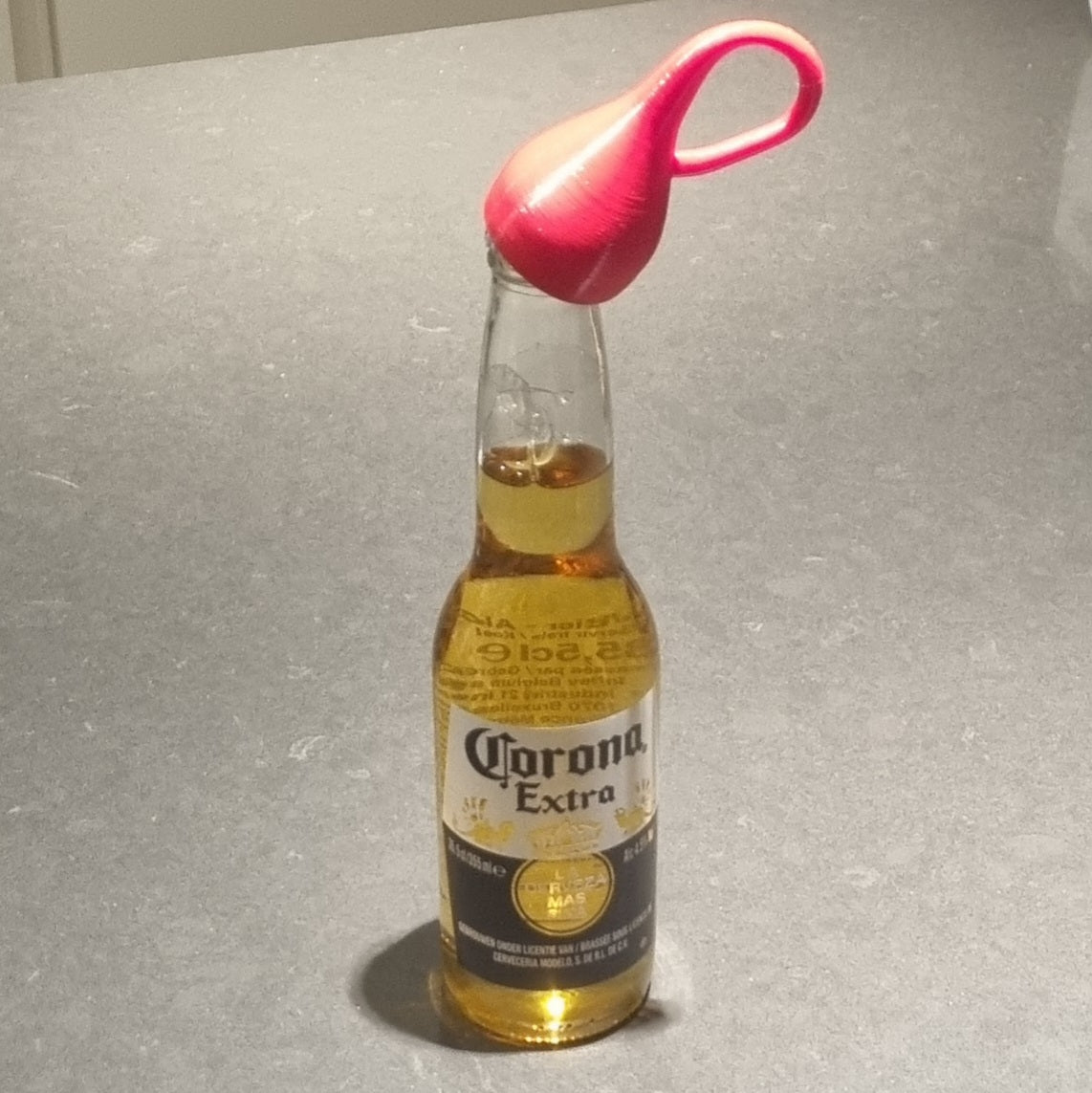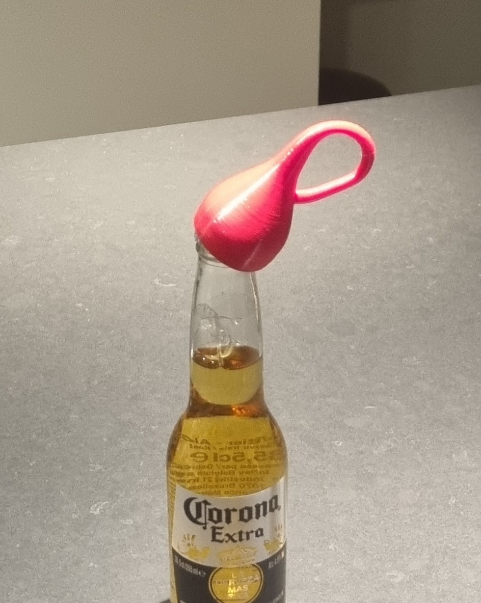Een flesopener in de vorm van een Klein-fles, een 4-dimensionaal object dat geen verschil heeft tussen de binnen- en buitenkant. Let op, deze print kan alleen normale flessen openen, helaas geen Klein flessen.