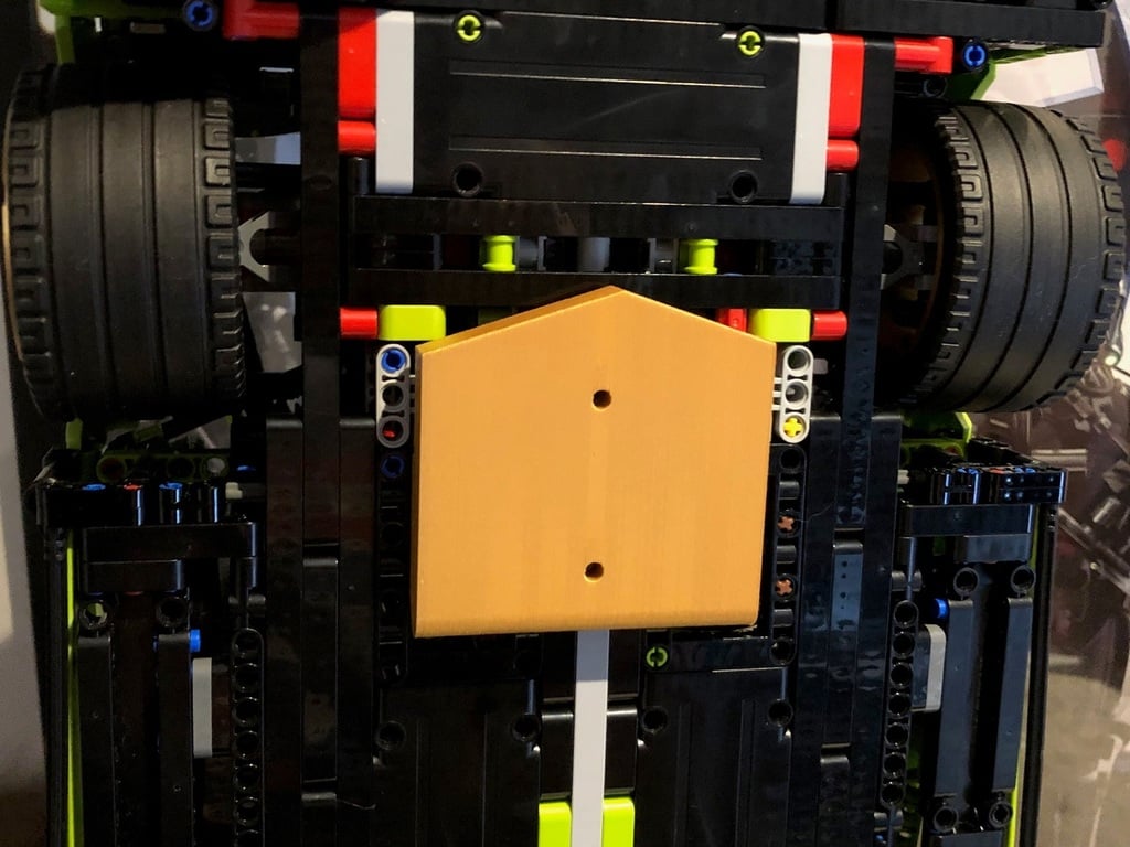 Dit is een 3D-geprinte wandmontage voor een Lego Lamborghini Sián FKP 37. Montagehaken schuiven in de twee gaten aan de onderkant van de auto. Let op de pijl aan de bovenkant van de montageplaat die aangeeft waar de centrale as van de auto zich bevindt.