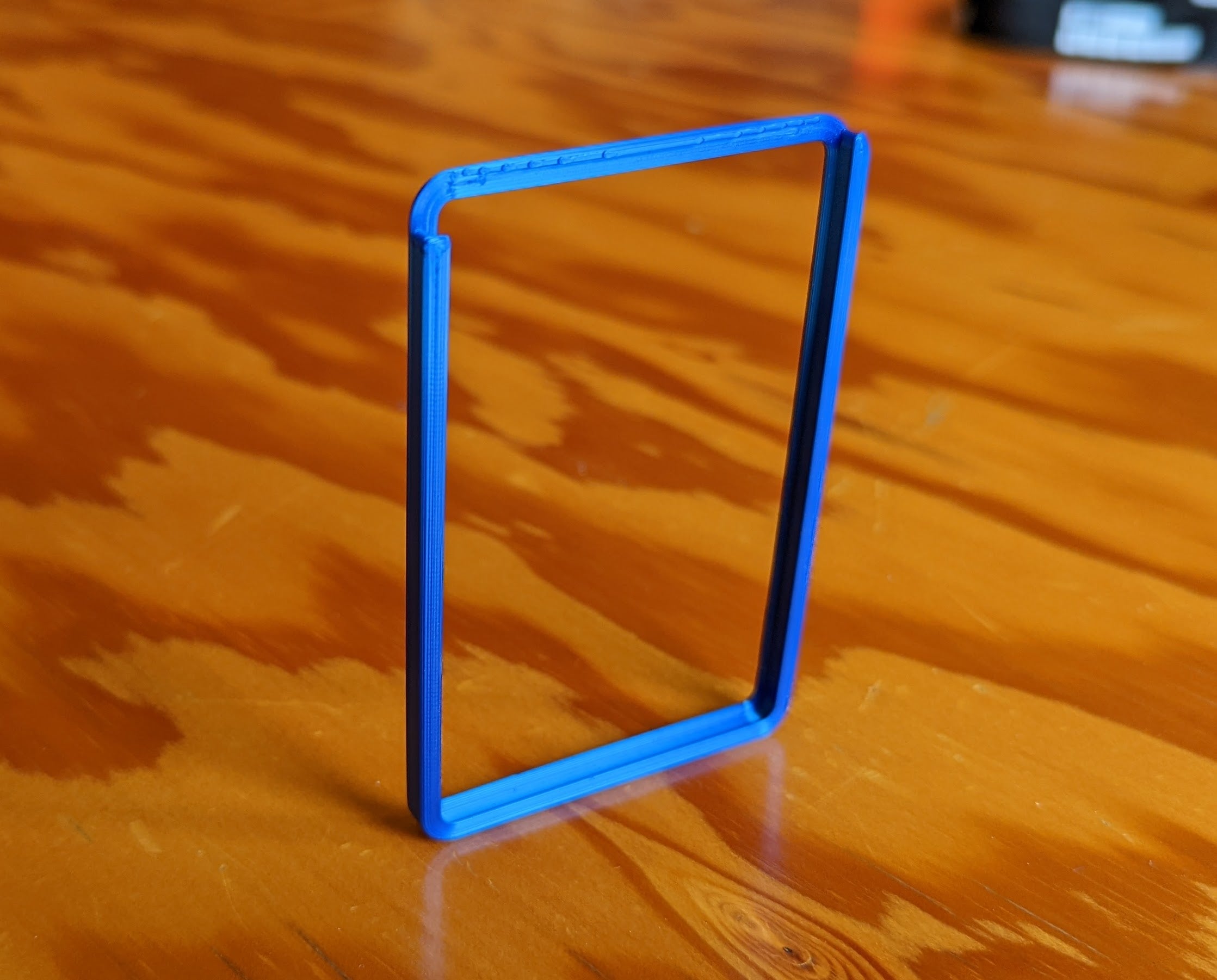 Minimalistische open portemonnee die in minder dan 20 minuten wordt geprint en ruimte biedt aan 3 tot 5 kaarten, afhankelijk van het model. De buitenste kaarten worden volledig weergegeven en alle kaarten worden op hun plaats gehouden door een klein randje aan de bovenkant. Een kleine variatie in de dikte van de kaarten past door de afgeschuinde bovenkant, die ook een verende druk biedt om de kaarten op hun plaats te houden. De buitenste kaarten kunnen met één hand worden verwijderd door de kaarten licht te buigen en aan de voorkant omhoog te duwen.