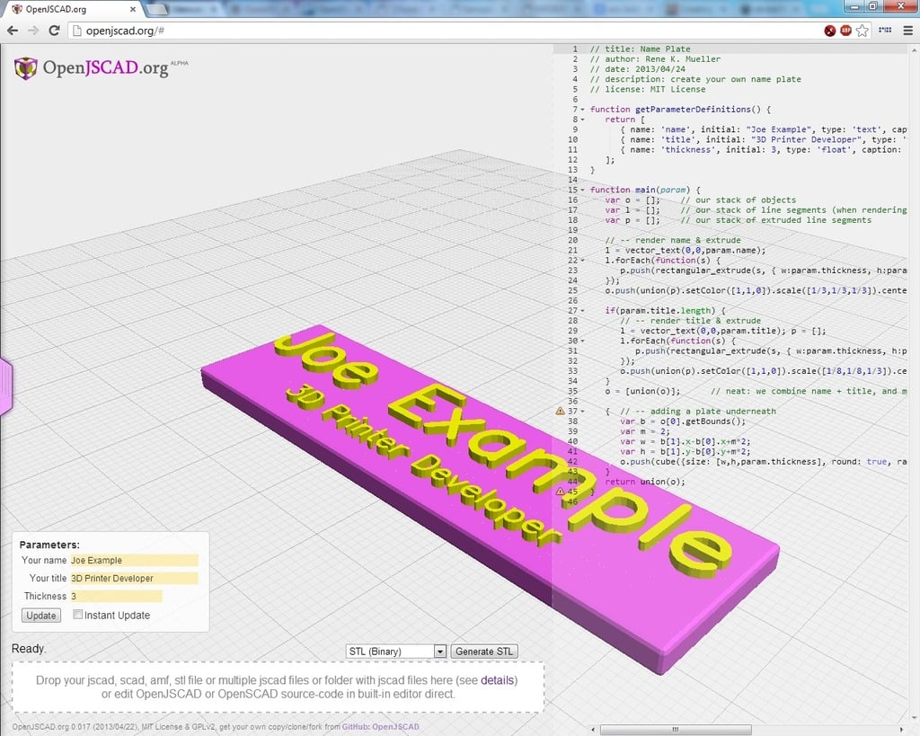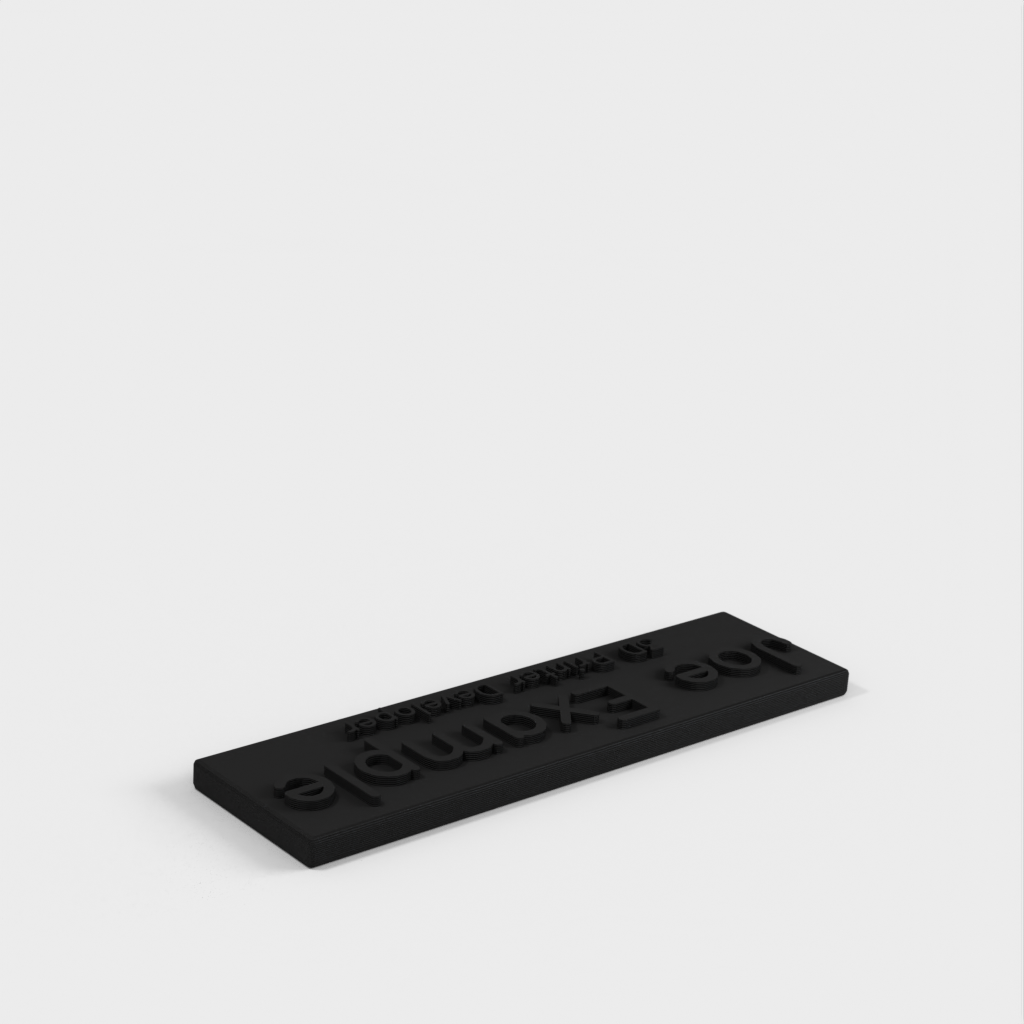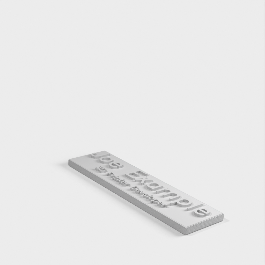 Naambordgenerator van OpenJSCAD waarmee je je naam en titel kunt invoeren en een aangepast naambord kunt maken om af te drukken. Het voltooide STL- of AMF-bestand kan eenvoudig naar je printer worden geëxporteerd.