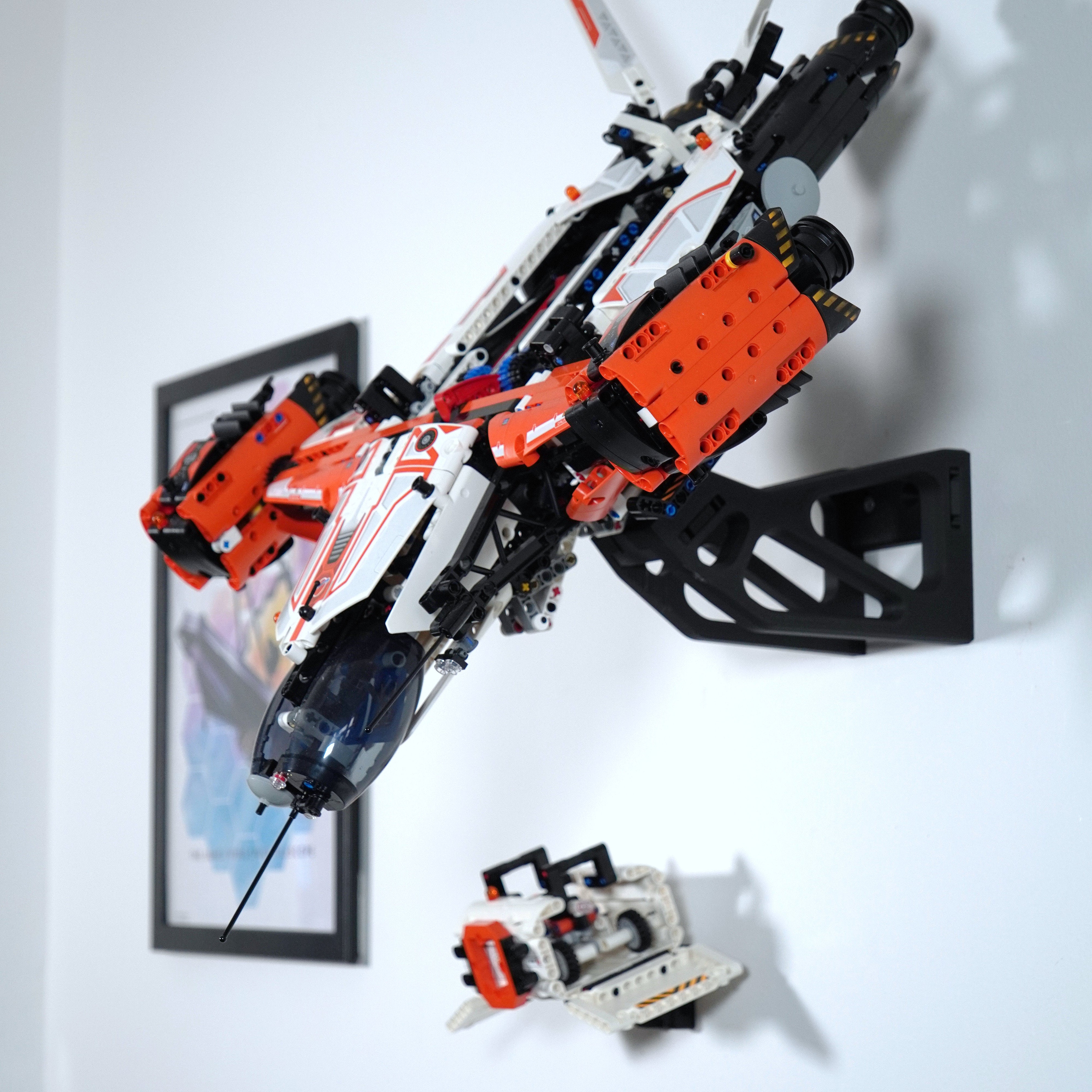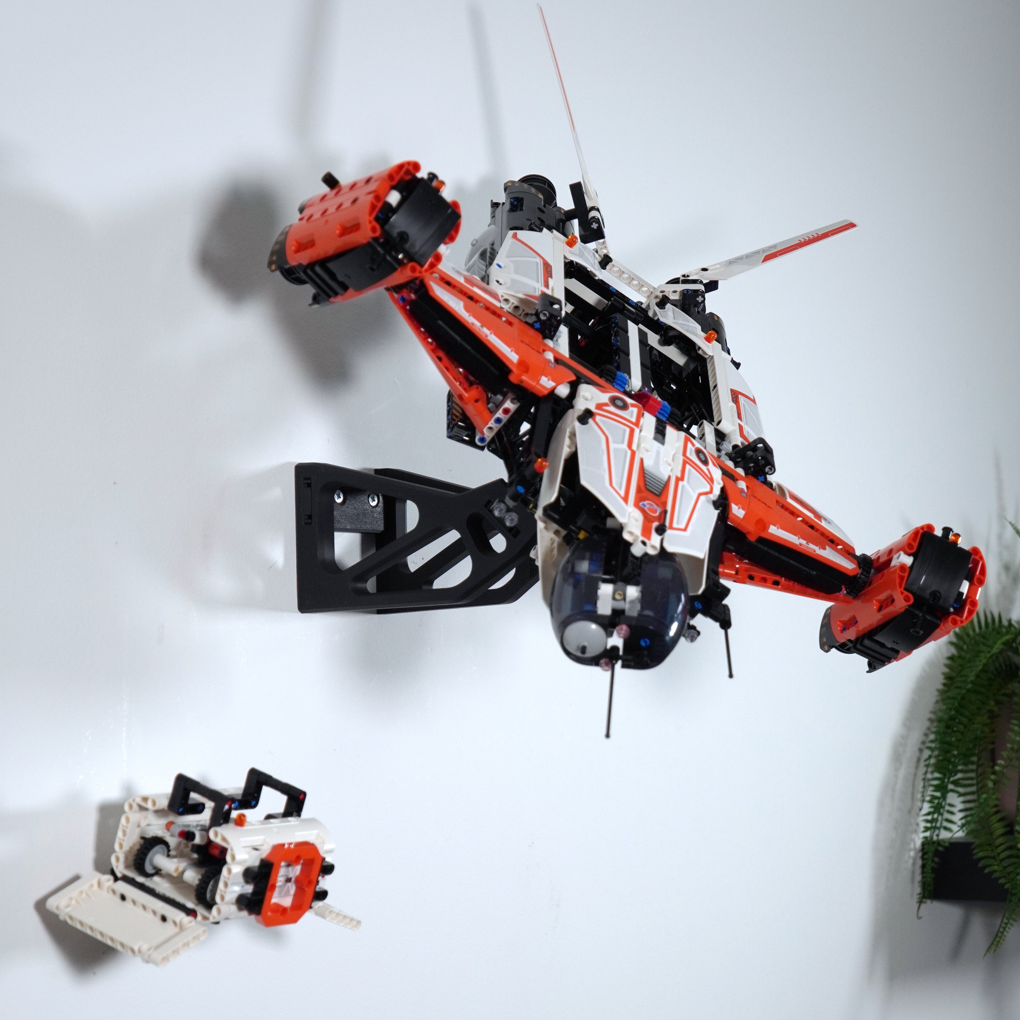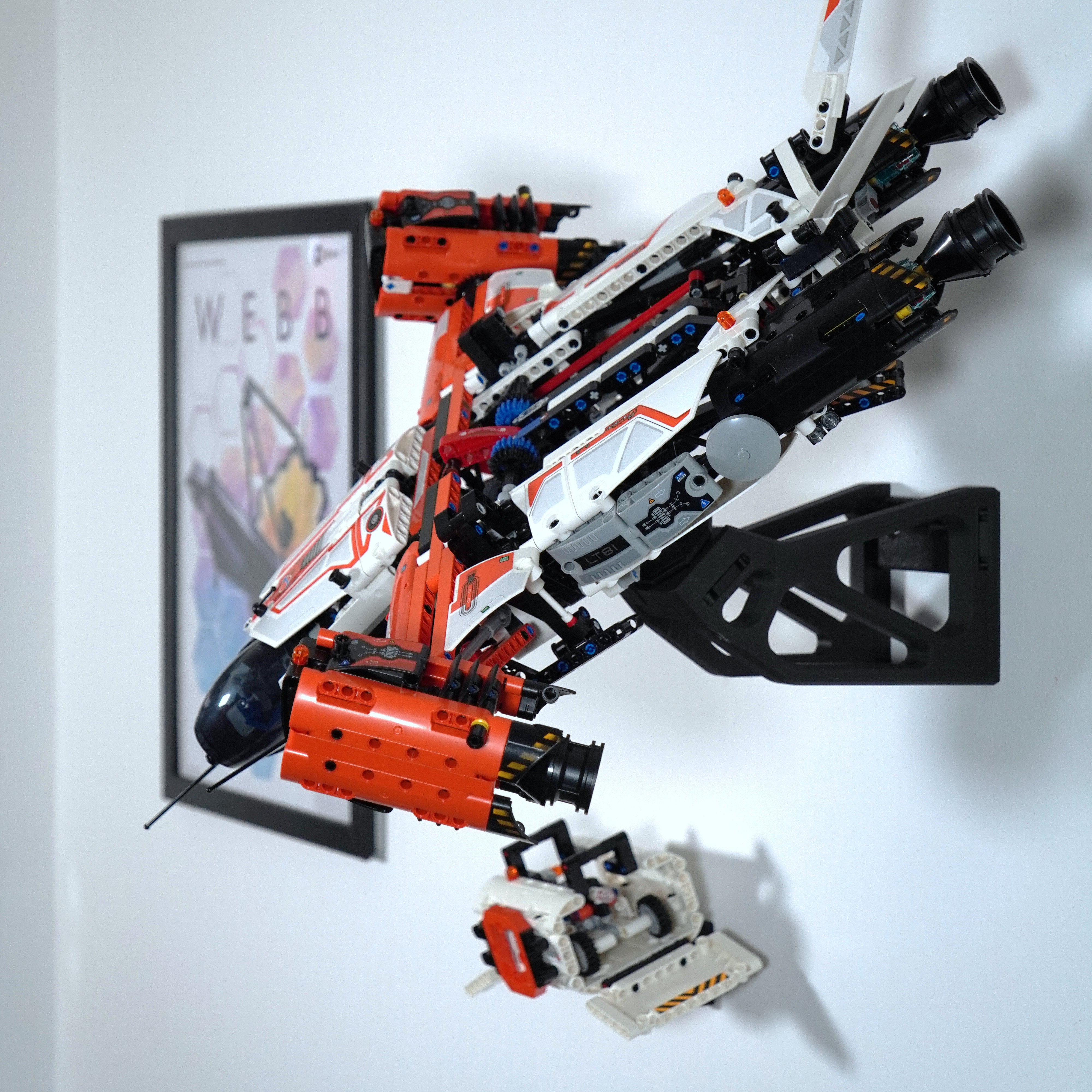 Presenteer uw Technic Space VTOL Heavy Cargo Ship veilig met deze verstelbare wandhouder. Hij ondersteunt verschillende hoeken, zoals naar voren of naar de zijkant, en maakt eenvoudig losmaken mogelijk. De set bevat ook een aparte houder voor de container en de rover, zodat het hele model samen aan de muur kan worden tentoongesteld.